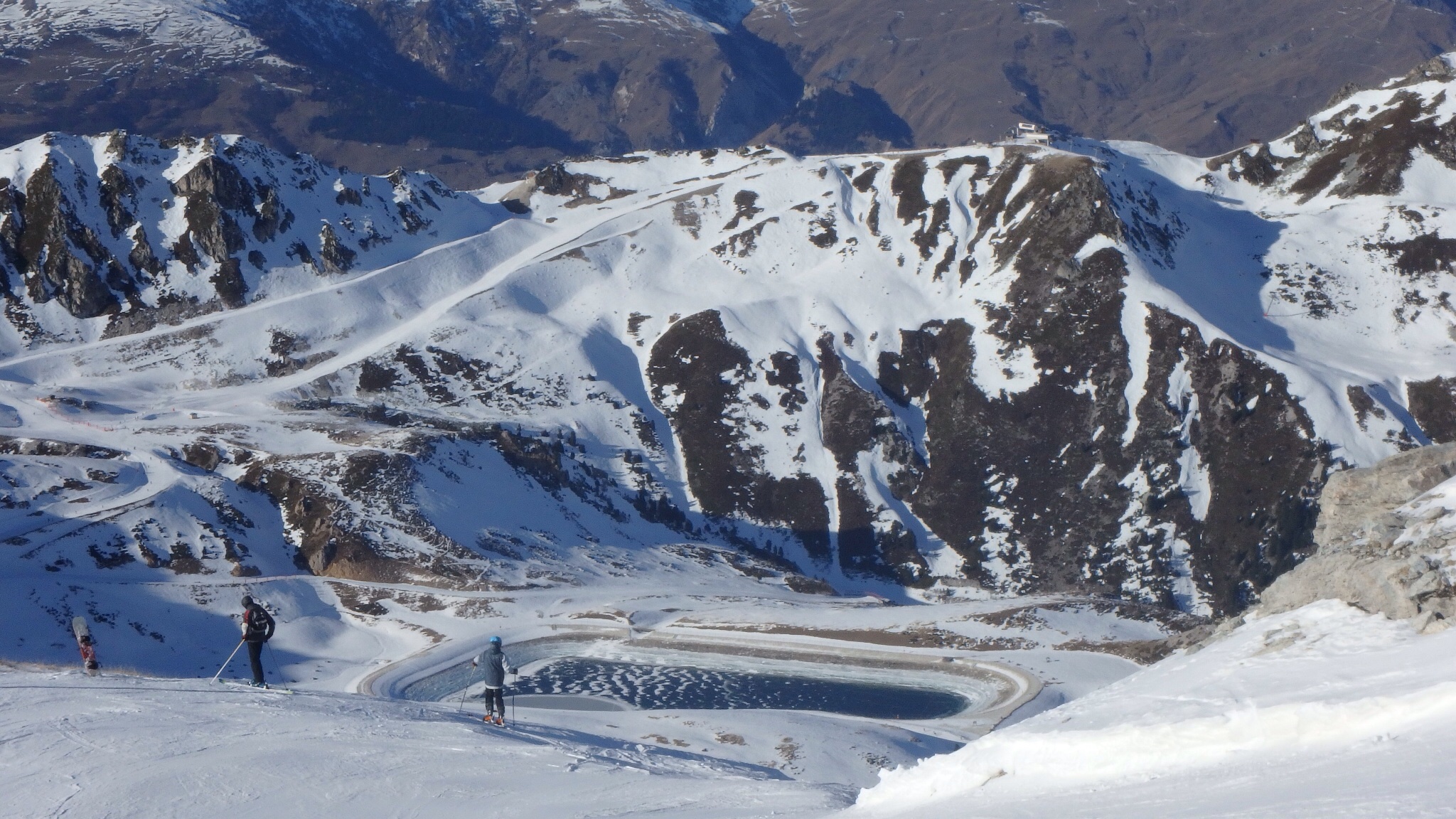 L'enneigement s'est nettement amélioré mais reste très en deça de la normale. Les granges, La combe fermée. Et c'est pareil à Val ou à Tignes (épaule ouverte qu'au 2/3, La Sache bien dure en bas, ....). Les Vernettes sont (encore) accessibles à skis par le toboggan de la mort (Combe fermée) et le chemin piéton à flanc de montagne mais pas en direct en hors-pistes. Des skieurs montaient à l'Aiguille Grive en fin de matinée. Quand on la chance de tomber sur un champ de poudreuse suffisant, elle est exceptionnelle compte tenu du froid.