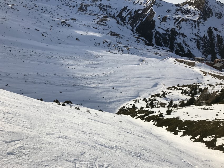 Cette année, il y a eu un énorme boulot d'enneigement artificiel qui nous a permis de skier à peu près partout avec une petite couche de neige solide. A 2000, ça roule. A 1800 et Peisey, on a fait l'Ours en boucle durant des matinées entières tellement elle était agréable ! Les Reches étaient chouettes aussi. Certes, on croise souvent des coins gelés, mais au moins il y a de la neige sur toute la longueur ET la largeur des pistes. Et la concentration des skieurs sur les pistes ouvertes était tout à fait supportable.