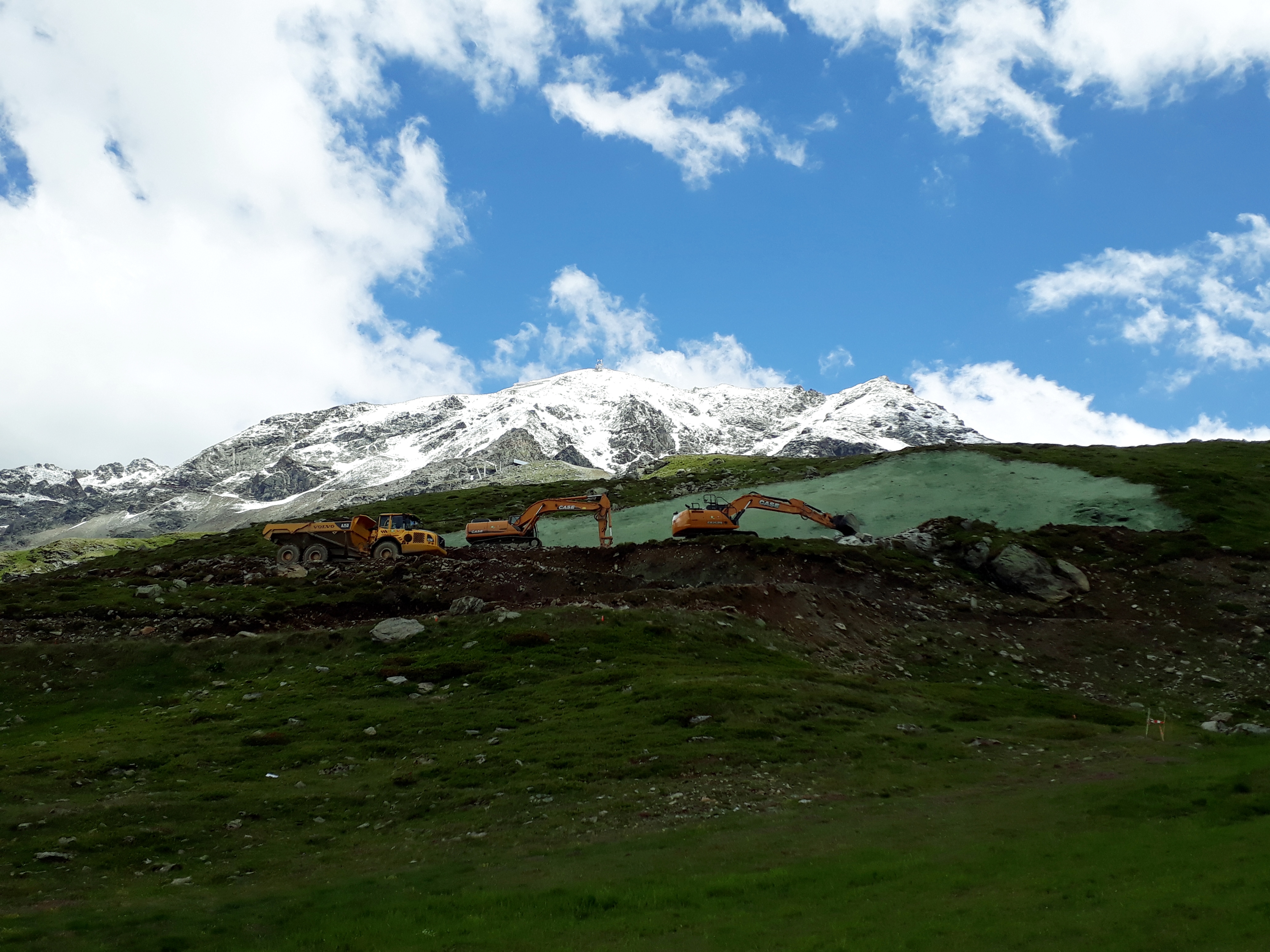 Piste Vallée de l'arc: Terrassement sur la partie basse en cours, neige de culture installée sur le tronçon Usine a neige -> G1 Marmottes.