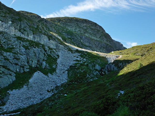 Il est à mi-chemin entre la station intermédiaire de la télécabine de Bellecôte et le lac da la veliere