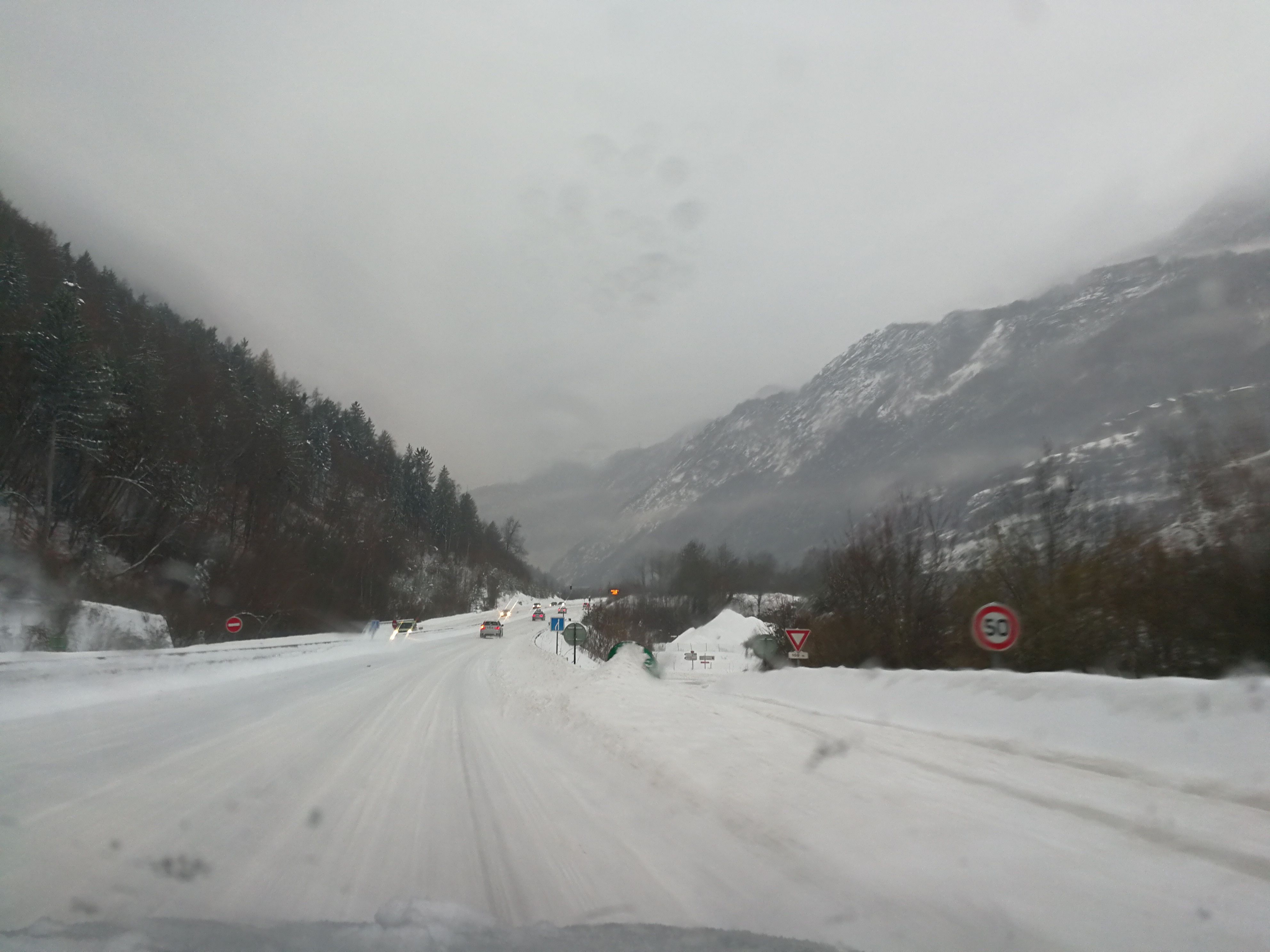 De retour de La Plagne voici quelques photos pour décrire la situation à 15h00 ce Dimanche. En descendant la température faisait le yoyo entre 0 et -1°C et à Aime il faisait -1°C. Sur tout le trajet la route était blanche malgré les nombreux passages de chasse-neige. La dernière photo, c'est la RN 90 en direction de Moutiers depuis Aime juste avant le tunnel du Siaix.