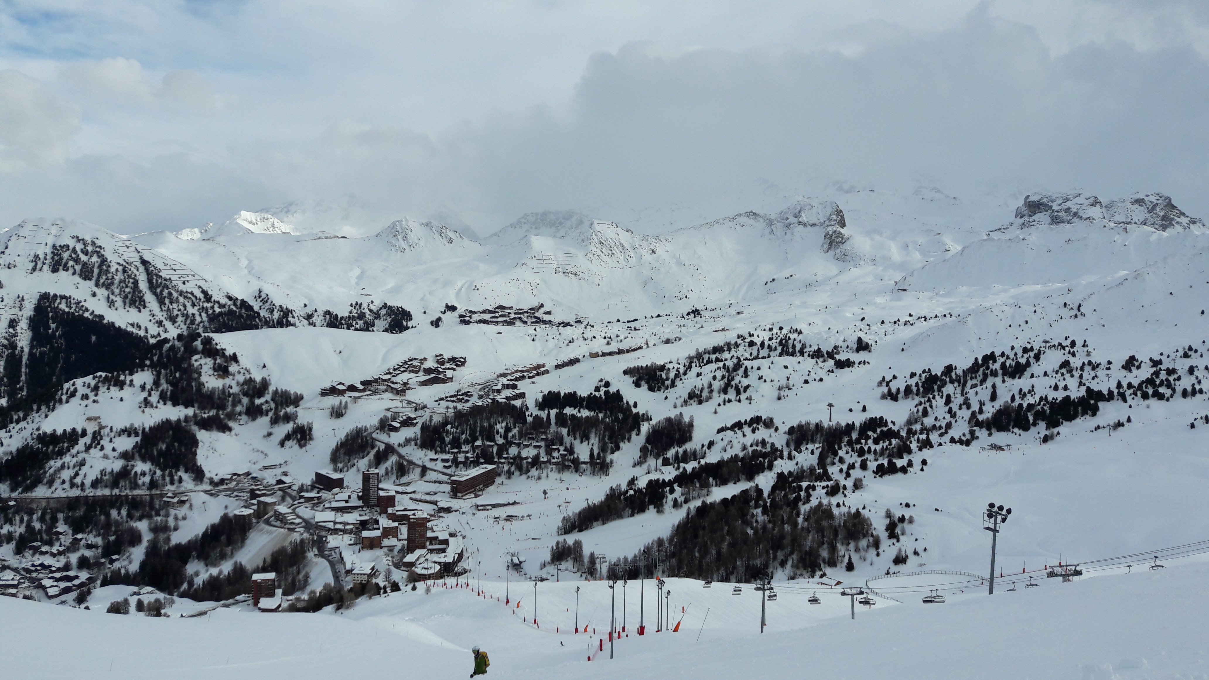 Jour de foehn aujourd'hui, beaucoup de vent. Roche de Mio et liaison Montchavin fermées. Neige meilleure qu'hier en dessous de 2100m (beaucoup moins dure).
