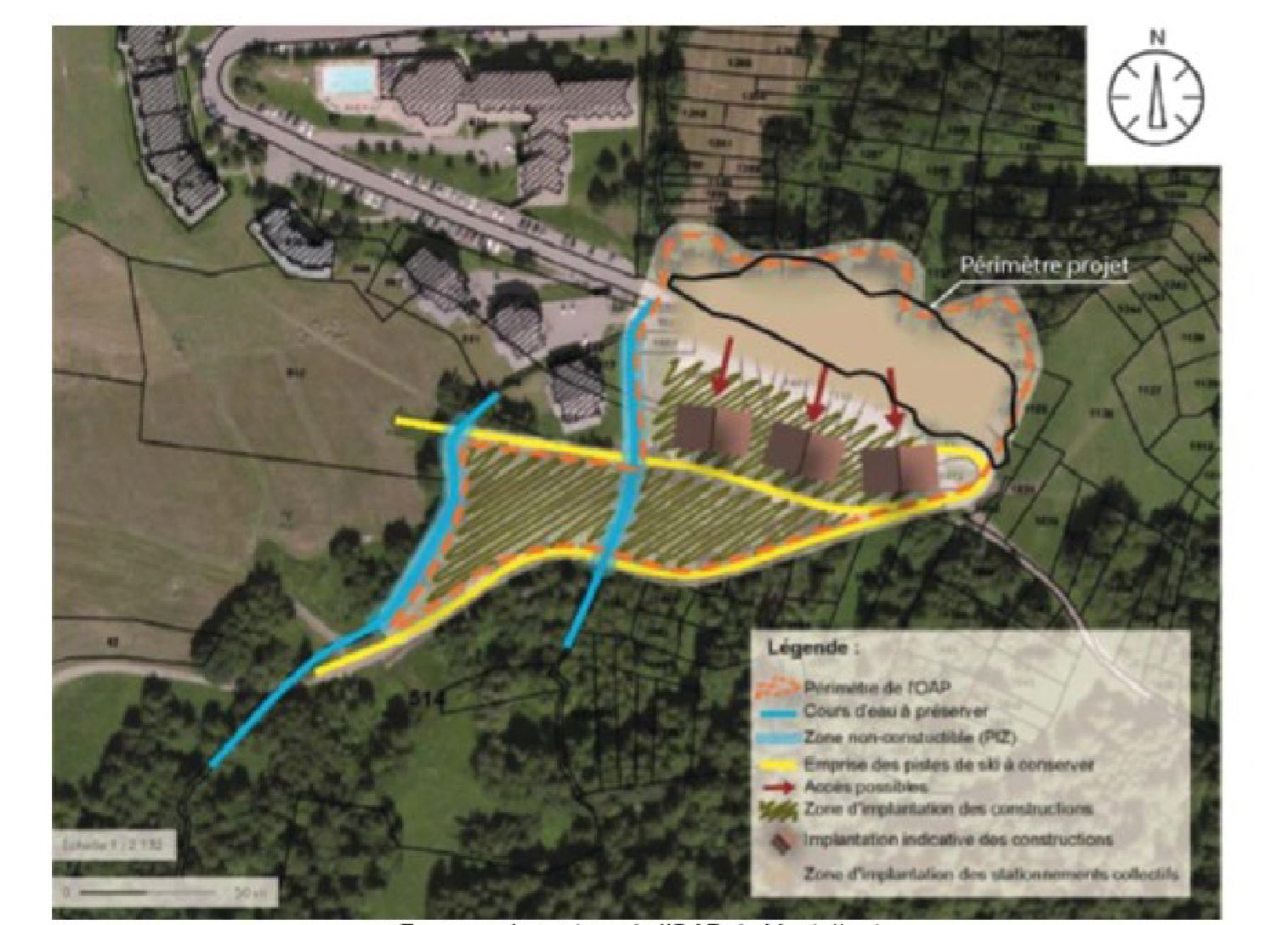 Périmètre du projet De nouvelles constructions sont envisagées dans les zones hachurées (actuellement forêt)... à mettre en relation avec le nombre de places du parking!
