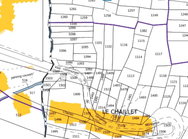 Pour se repérer, voici le plan cadastral: La zone de défrichement est moins importante que prévue initialement (-300 m2), est-ce le signe de la construction d'un parking réduit? Une place de parking, c'est 11,5 m2 (dimensions officielle : 5x2,3). Cela ferait 26 places de moins!