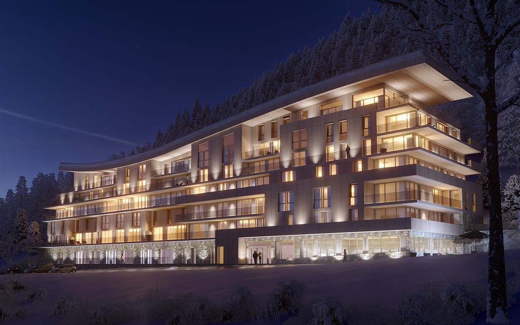 Des images du projet Le Ridge prévu (fin 2019 ???) pour remplacer le Béguin d'Arc 1600 sous le futur Club Med : Le bâtiment double le nombre d'étages R+3 ==> R+6. 51 appartements sont annoncés.