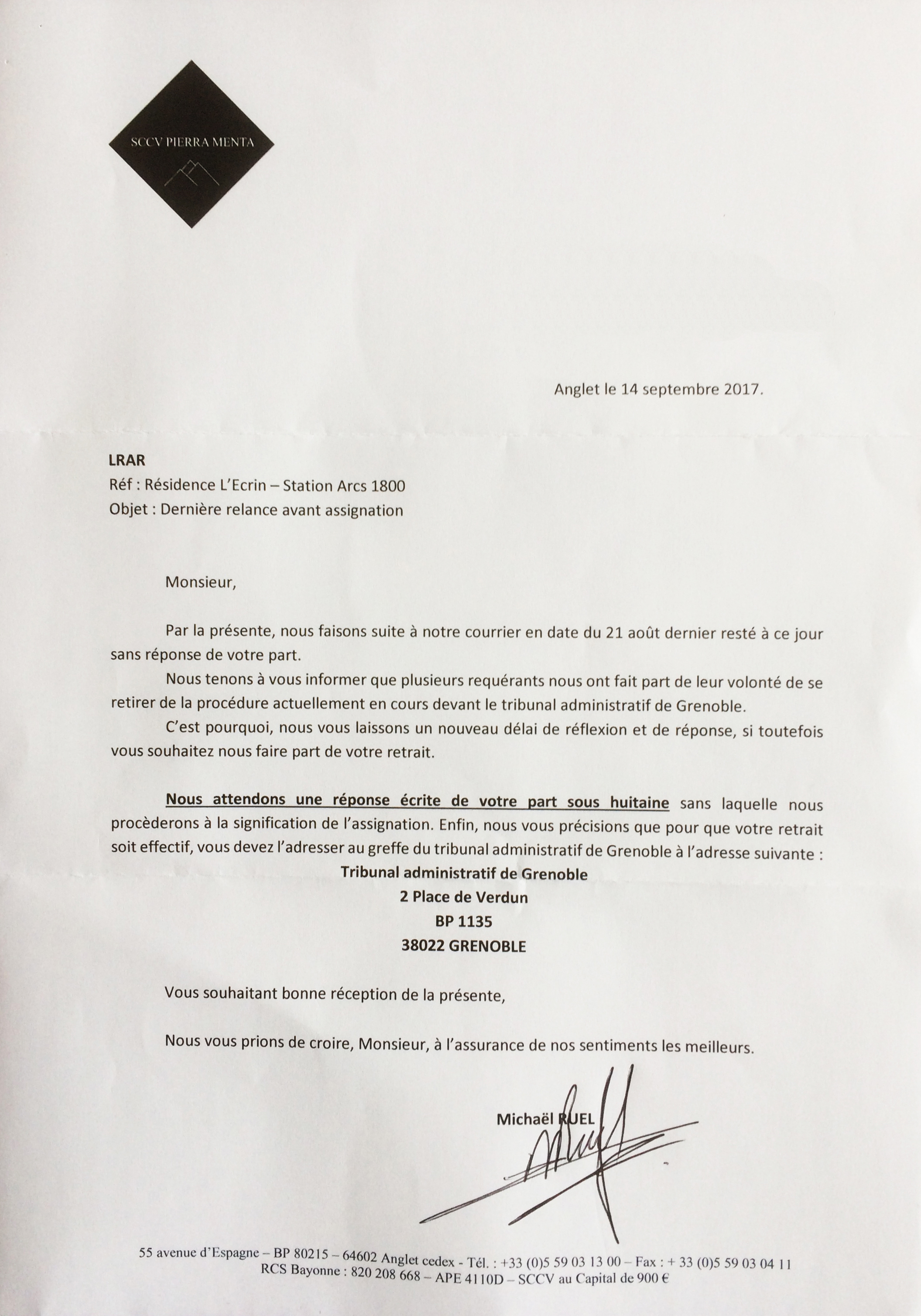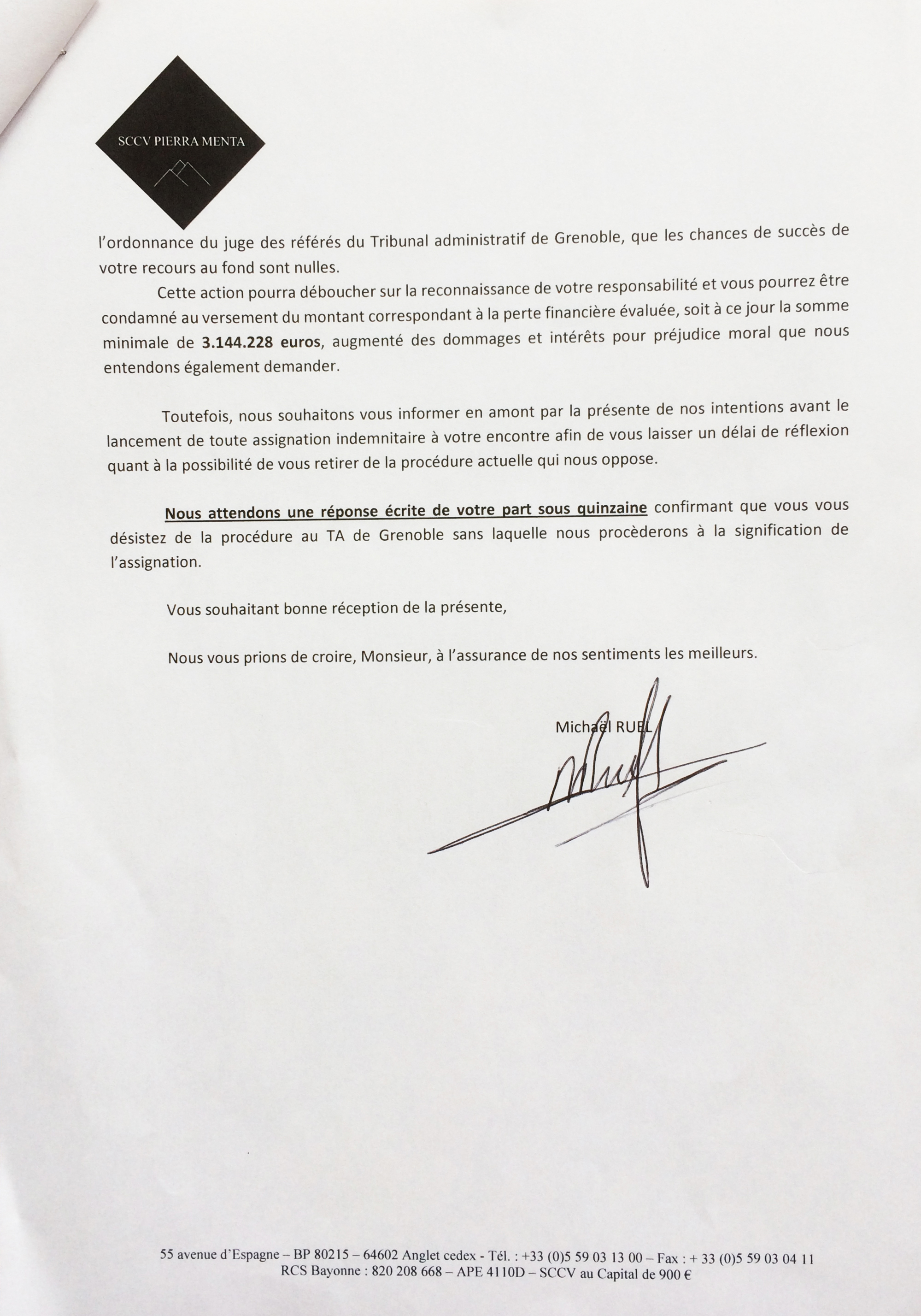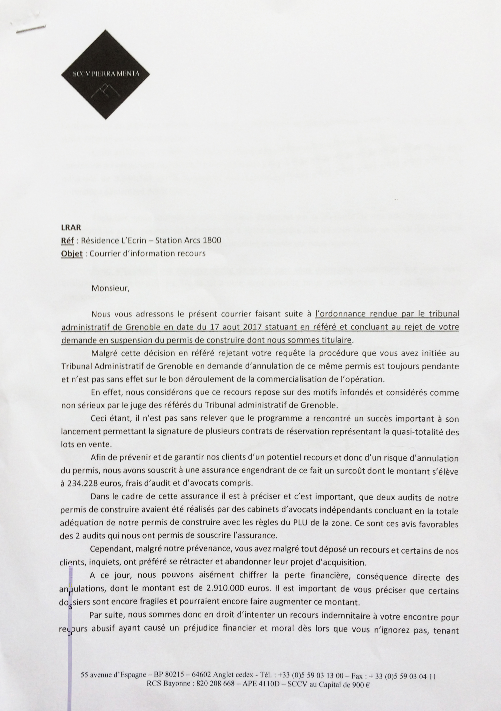 Mais voilà que comme la procédure de recours continue et que MJ Développement voit ainsi certains de ses acheteurs se désister, le promoteur menace directement par courrier les propriétaires voisins.... les menaçant de leur demander 3 million d'euros de dommages et intérêts s'ils ne se retirent pas de la procédure en cours contre son permis !!
