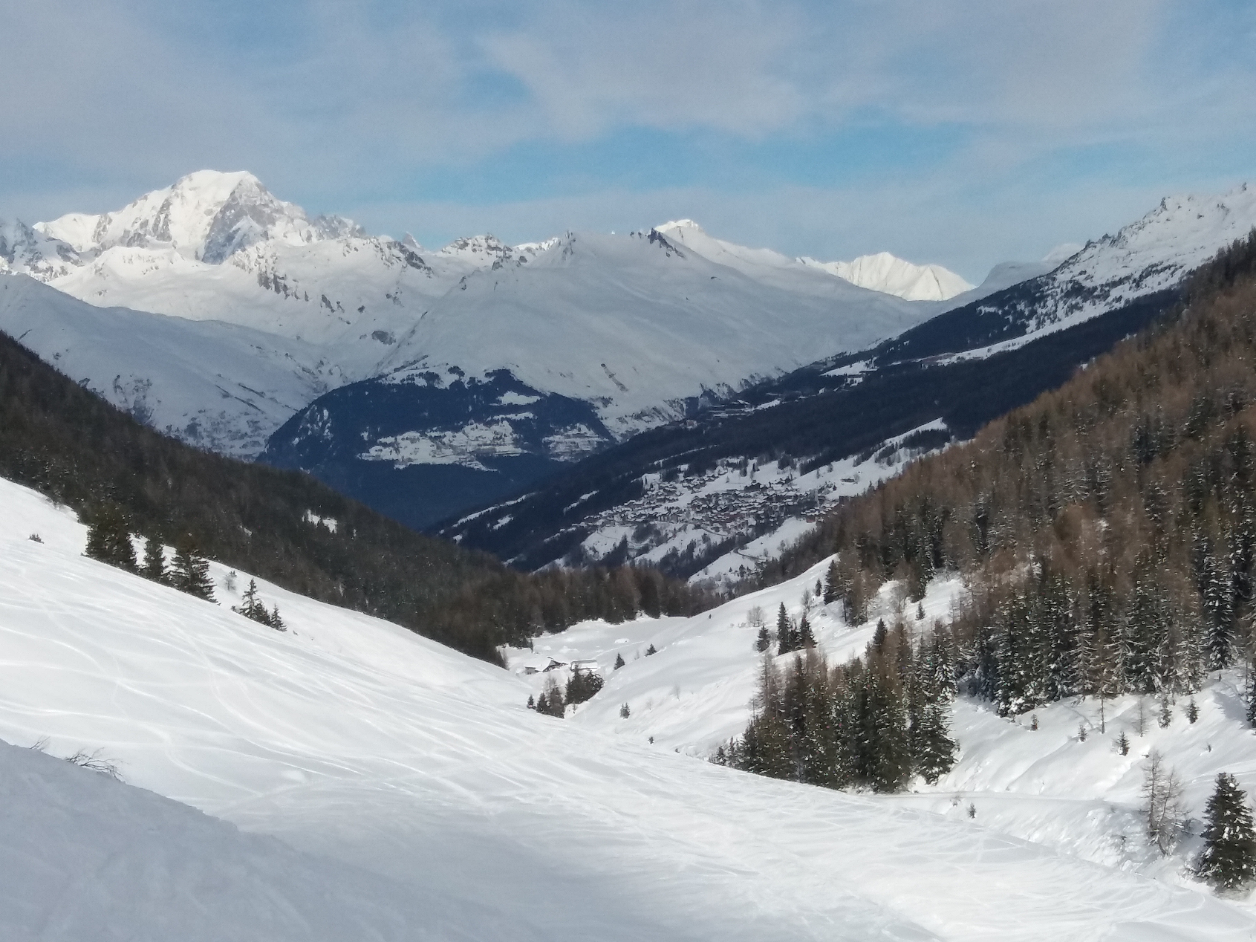 Jour de foehn aujourd'hui, beaucoup de vent. Roche de Mio et liaison Montchavin fermées. Neige meilleure qu'hier en dessous de 2100m (beaucoup moins dure).