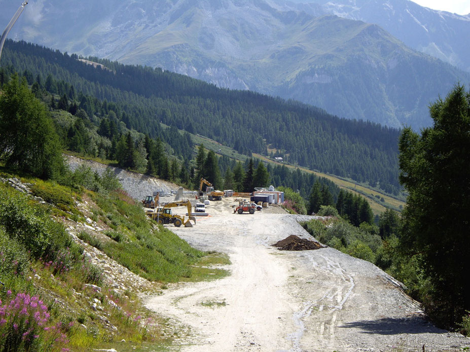 travaux de piste : c'est la bleue de l'Arpette qui est redessinée entre l' épingle au dessus de Vagère et l'entrée du snowparc.