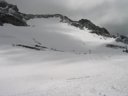 En bas du glacier, le manteau neigeux est encore là, mais ne doit plus être très épais.