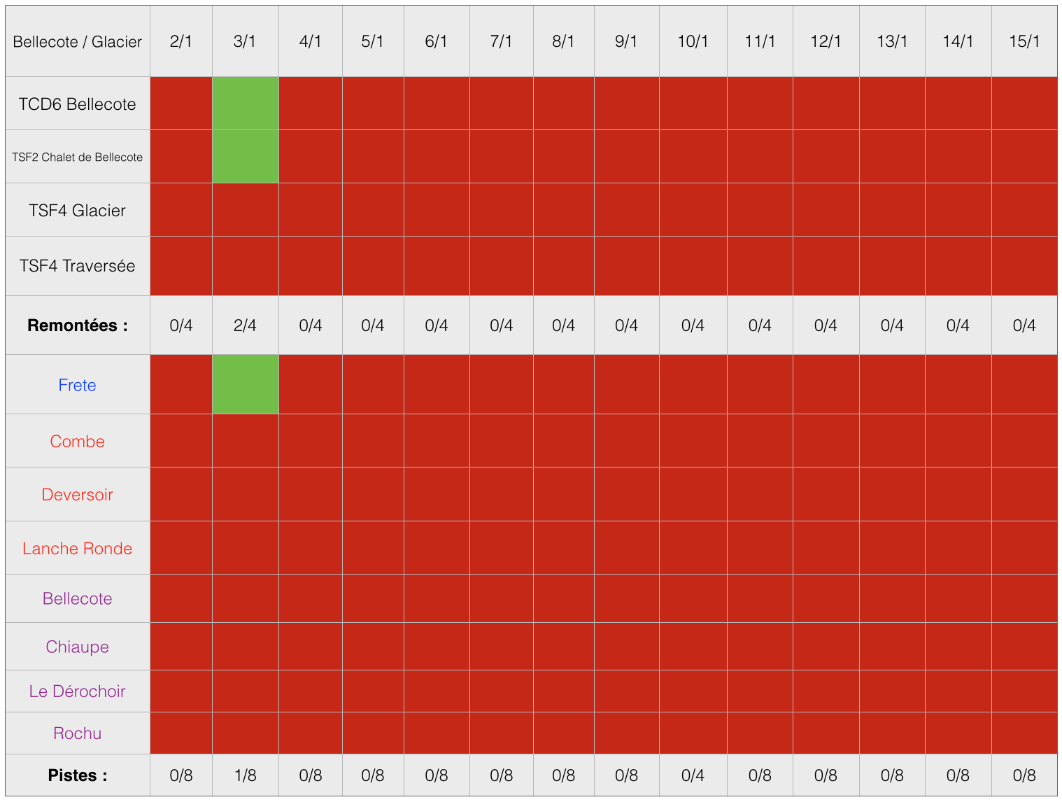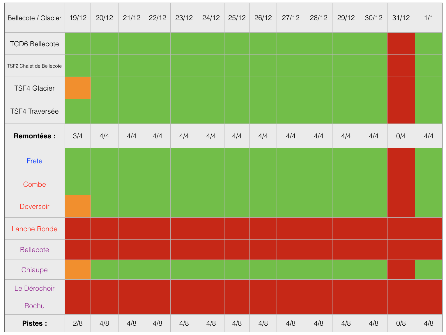 Le glacier a été ouvert 20 jours sur décembre (tous les jours depuis le 12), 12 jours sur janvier et pour le mois de février, le glacier a été ouvert 1 journée sur la première semaine (état au 5/02).