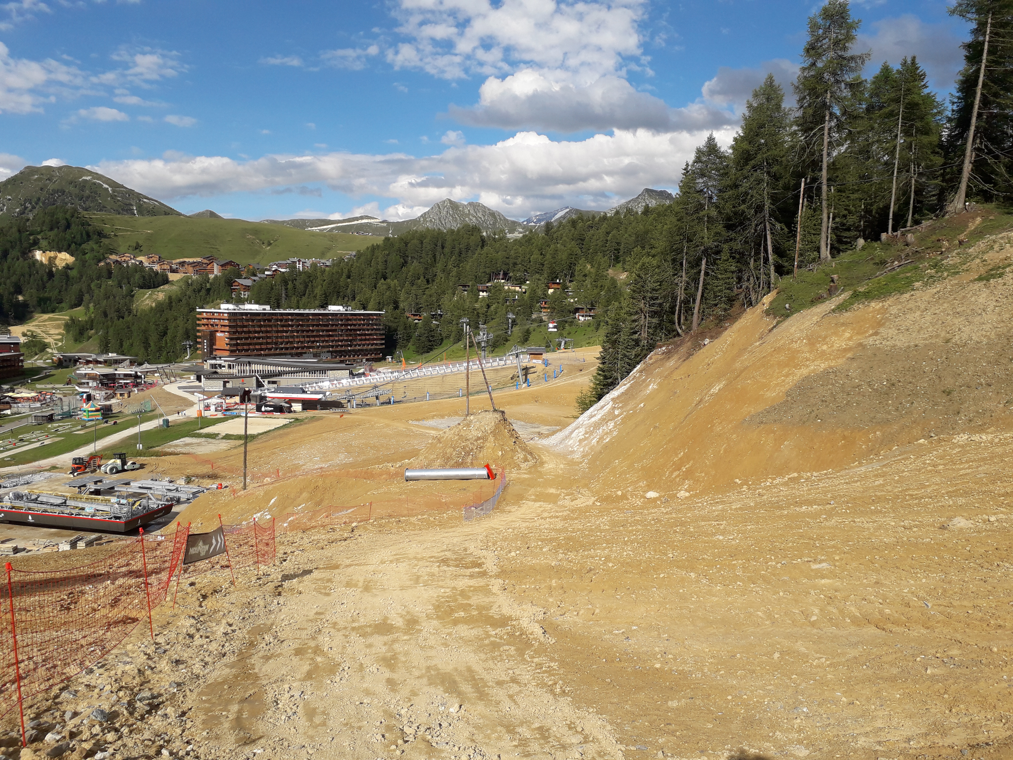 A propos, du reprofilage de cette zone, il y a désormais une marche d'environs 6 ou 7 mètres minimum entre la piste venant du front de neige de plagne Village (en bas) et la piste venant de Bergerie/Colosse (Bride ?).
