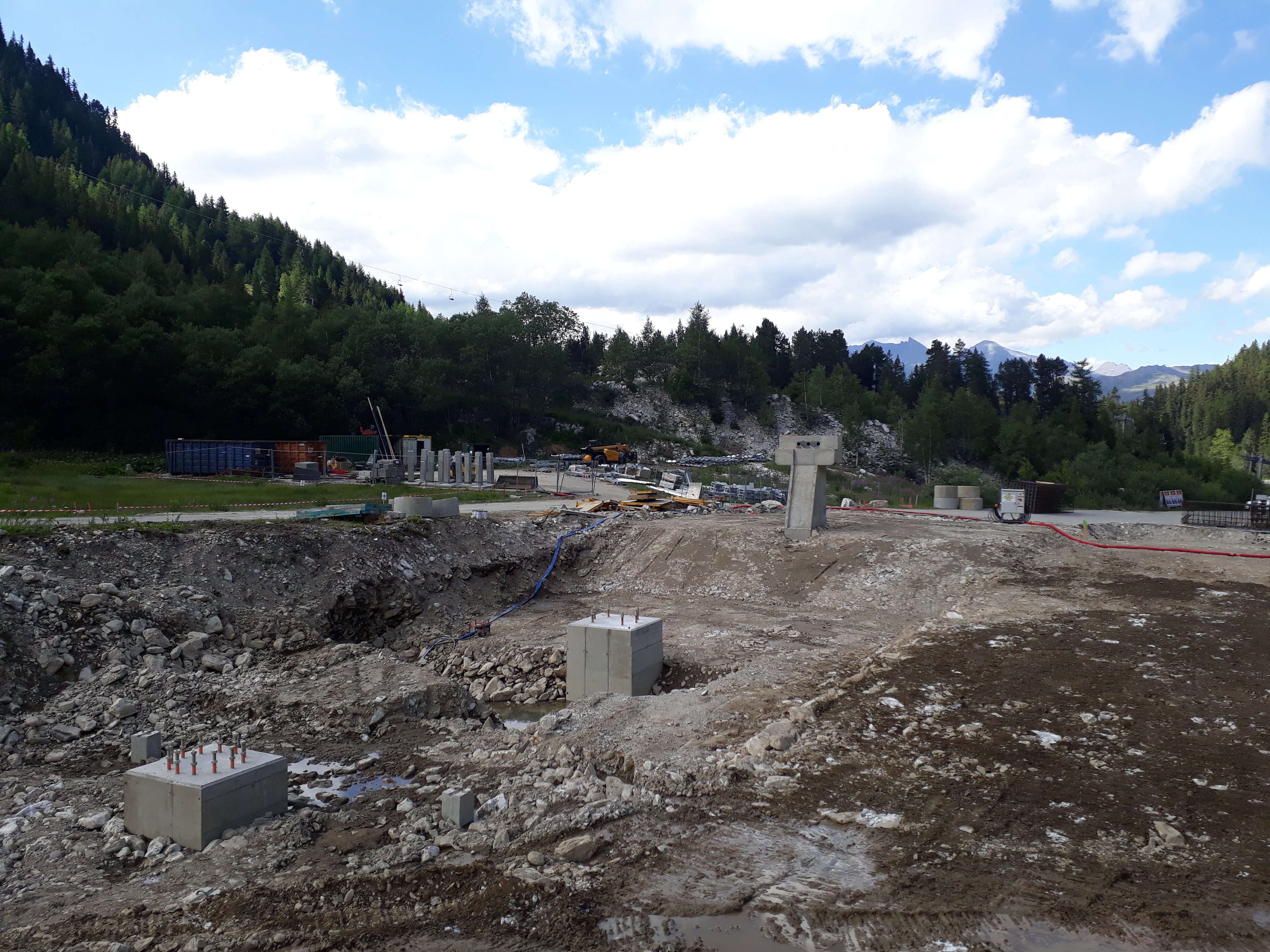 Ligne: Massifs terminés du P22 au P20, P17, P15 au P7, semelles coulées sur P2, P3. P2 Marmottes terminé. Ouverture des trous en cours sur P19,P18,P16 et P4.