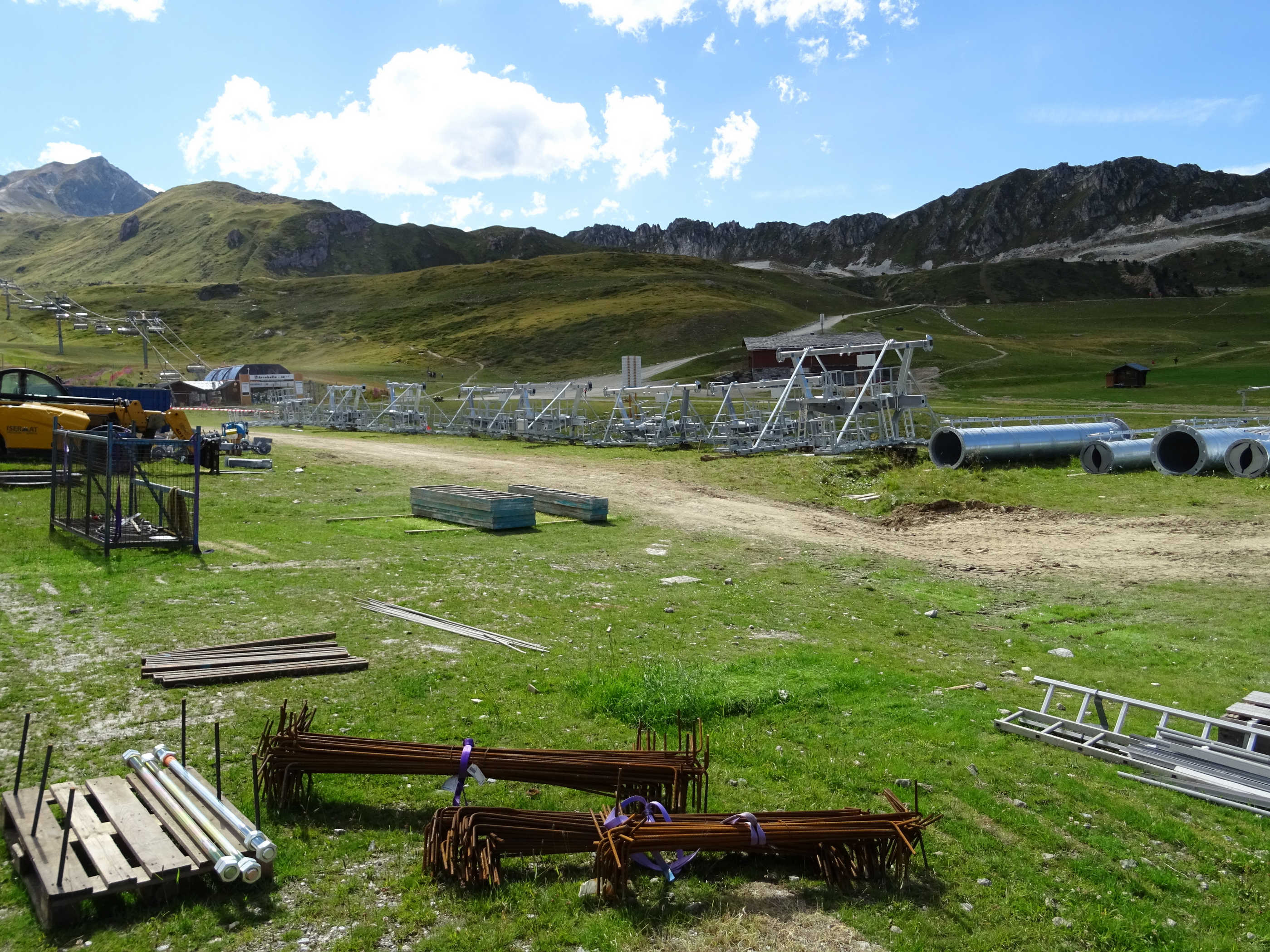 Piste Vallée de l'arc: Terrassement sur la partie basse en cours, neige de culture installée sur le tronçon Usine a neige -> G1 Marmottes.