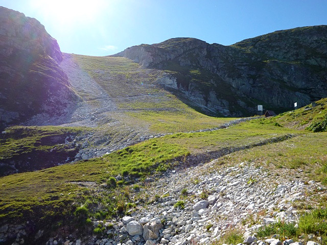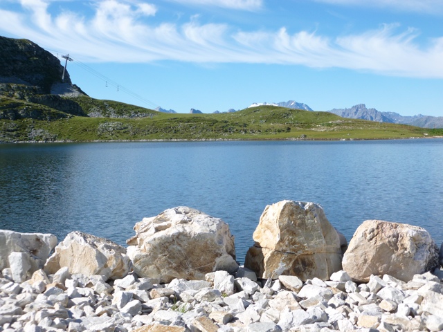 Il est à mi-chemin entre la station intermédiaire de la télécabine de Bellecôte et le lac da la veliere