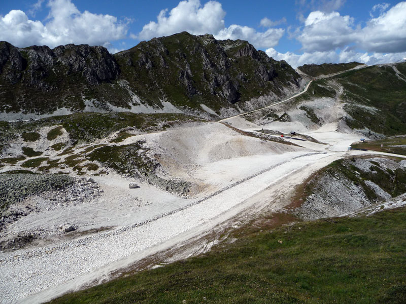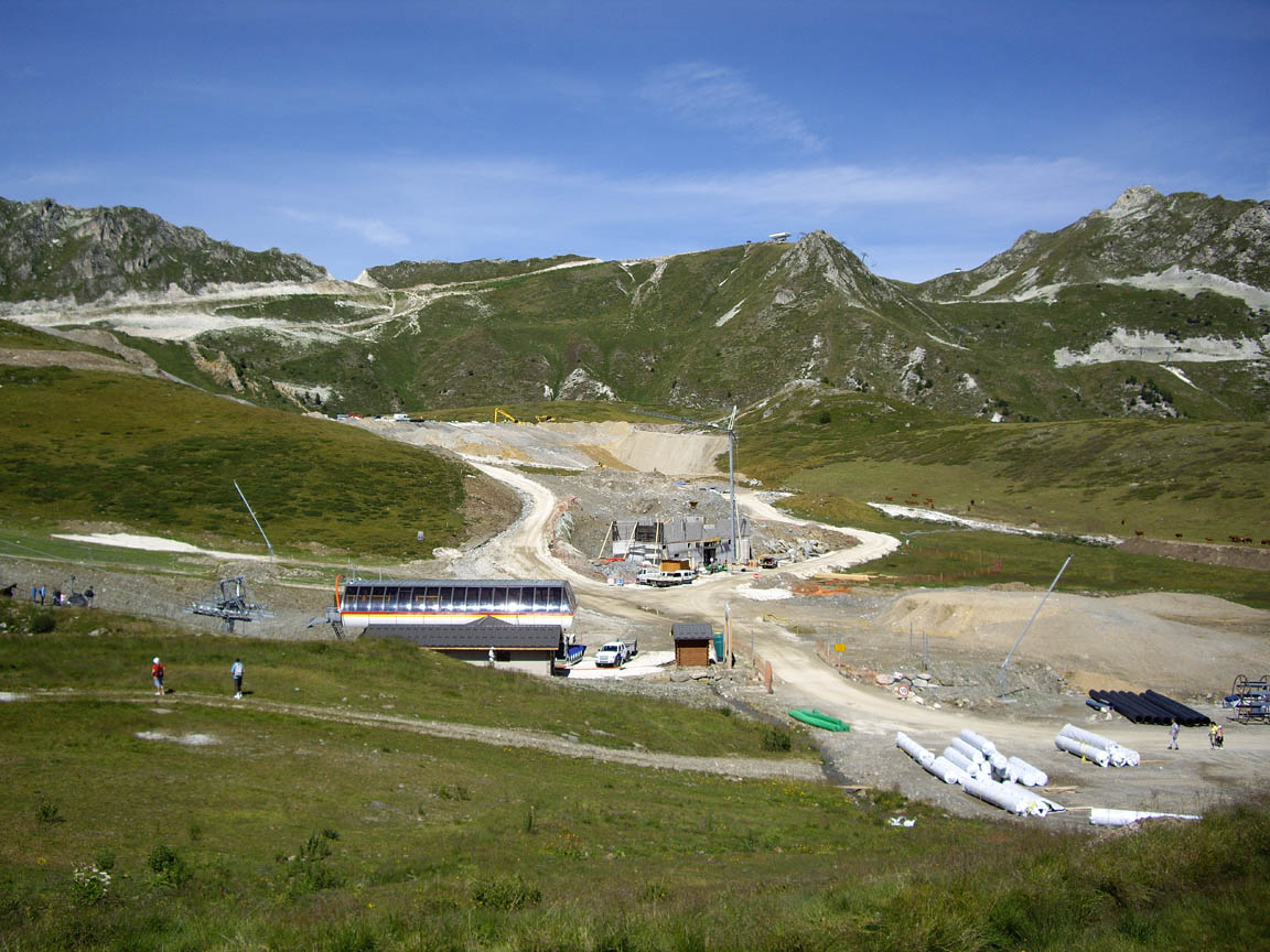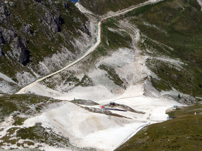 Encore une série de travaux autour, des conduites d'eau (pour l'alimentation des travaux ?) sont en cours d'enfouissement jusqu'à 2000 et sur la piste qui descend du bois de l'ours (edelweiss) et le lit du torrent qui passe vers la piste du lac a été remodelé, voire canalisé.