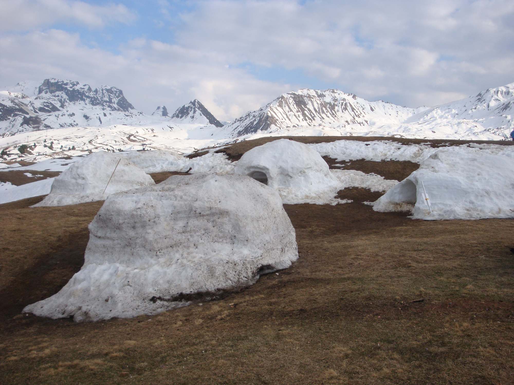 Deux photos du village igloos sur le site du Dou du Praz en avril 2011, l'année où la neige a fait défaut en fin de saison.