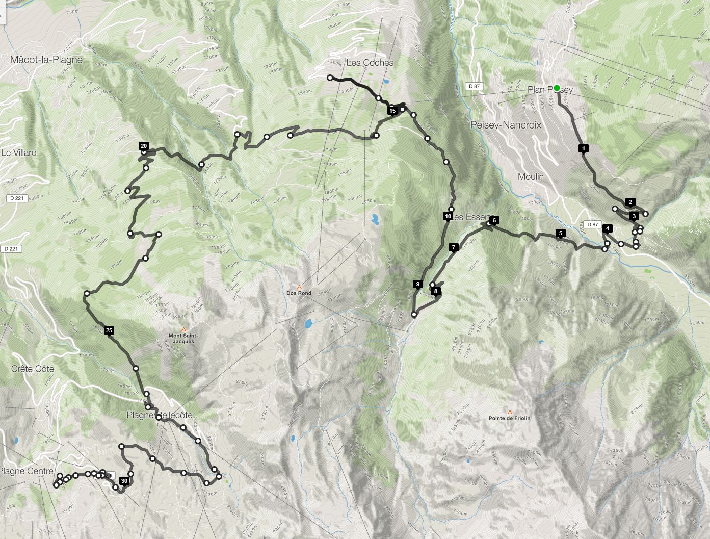 En effet le secteur 25 (piste de fond de bellecote aux frasses) est un peu trop raide pour un velo de route, surtout la descente juste apres le transfo EDF de plagne bellecote.