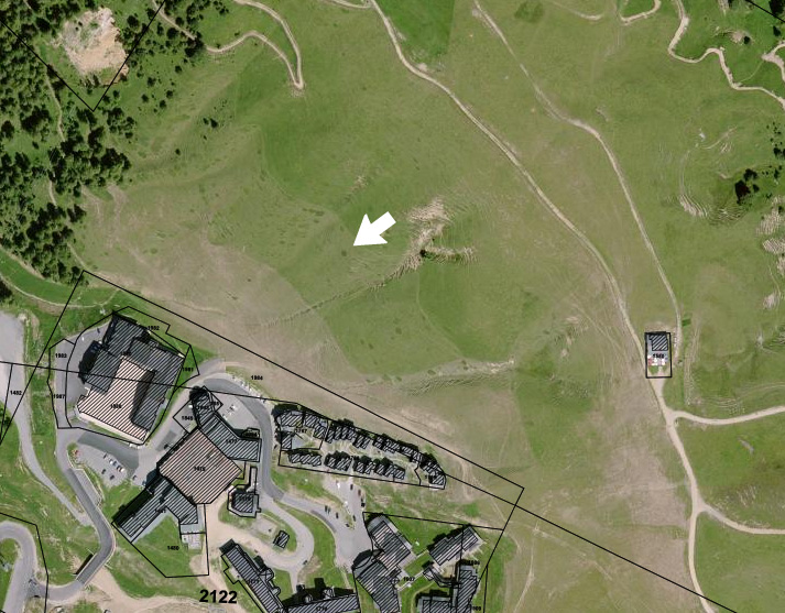 Une des parcelles concernées (la 150N - 1552, qui est très vaste) est bien celle qui n'est pas encore urbanisée (la flèche blanche)Autorisation accordée au groupe NEXALIA pour déposer un permis de construire pour le Diamant Blanc au Dou du Praz