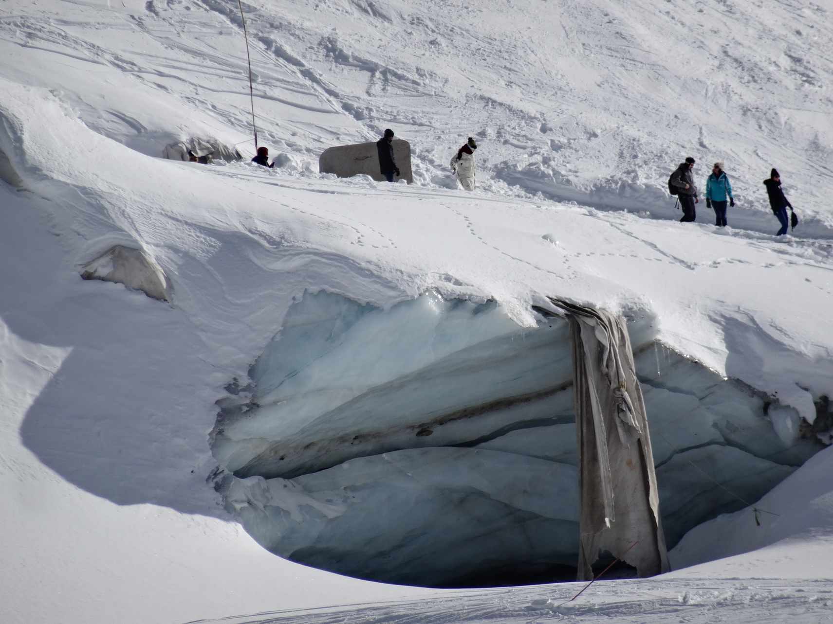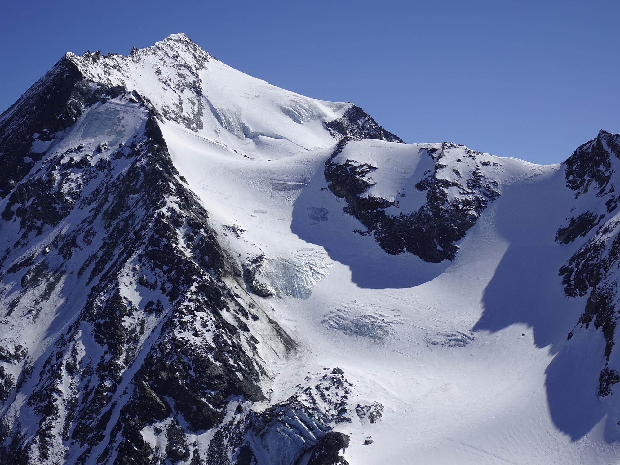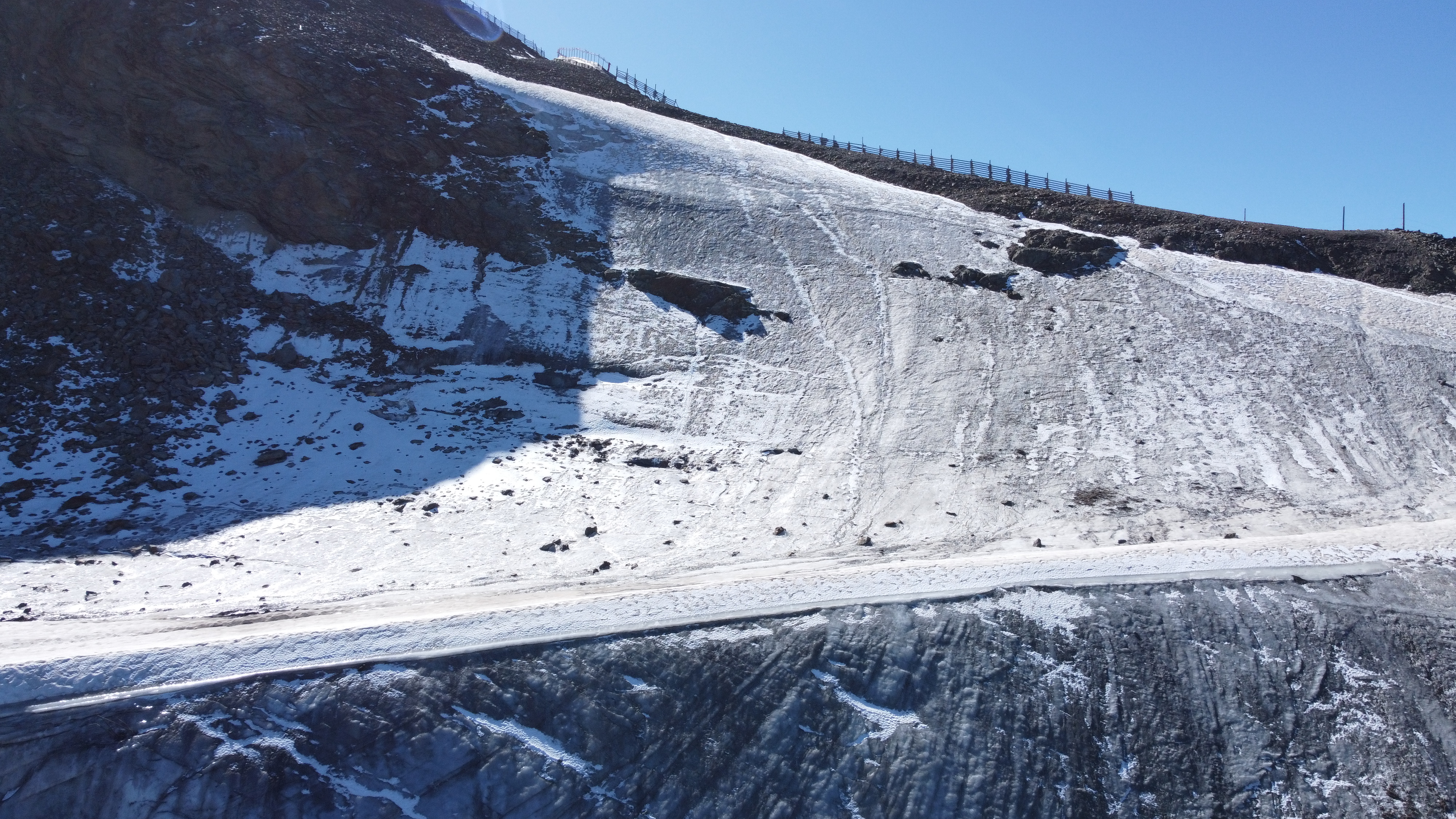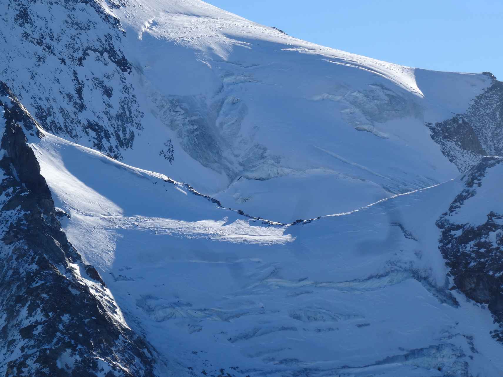 Une partie de la neige au-dessus de la partie "plate" du glacier s'est détachée (naturellement ou déclenchement ?) laissant apparaître une marche verticale de 2 à 3 mètres.