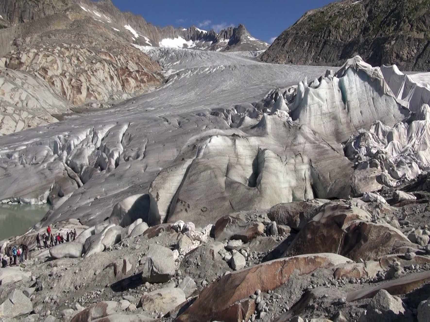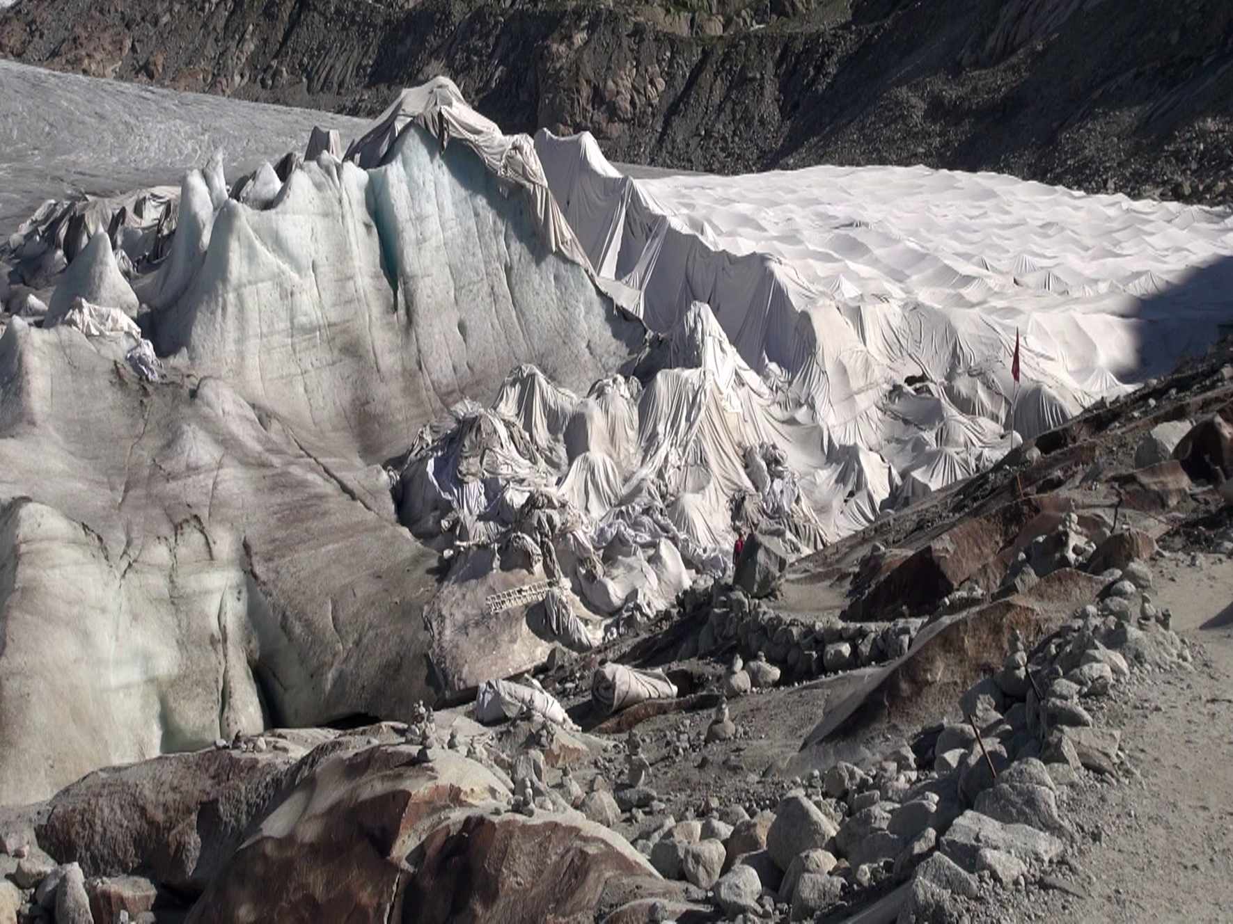 Le glacier des sources du Rhône avait aussi sa couverture, pour protéger sa grotte, pendant cet été (août 2015) :