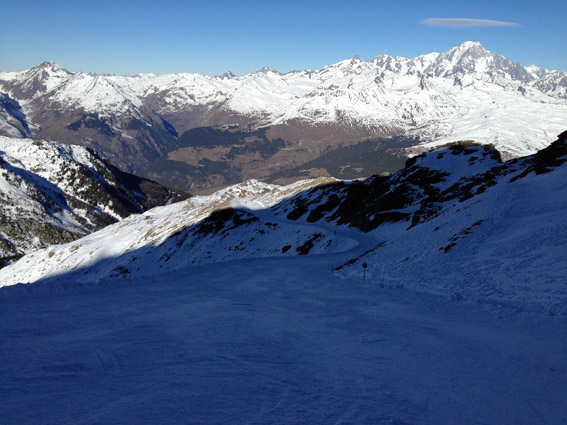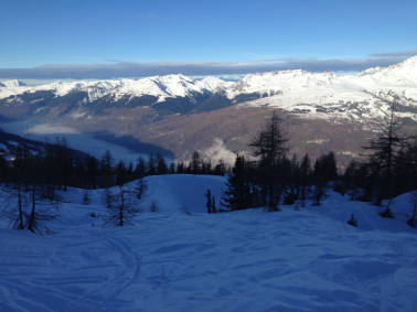 Aiguille Rouge toujours bonne et neige plutôt agréable, y compris vers les Violettes en descendant vers Villaroger, même si pas mal de pistes sont fermées.