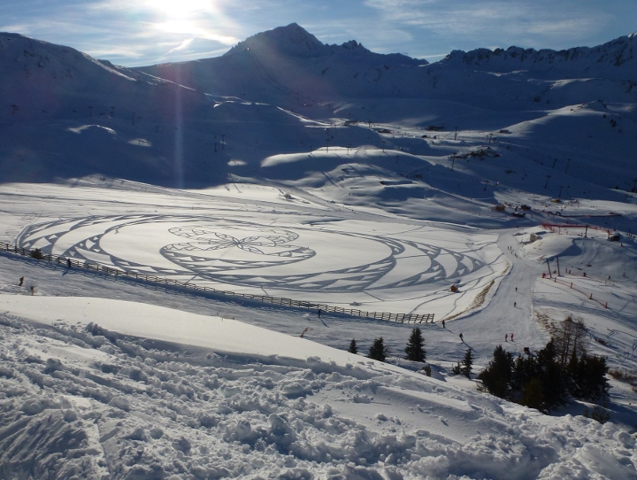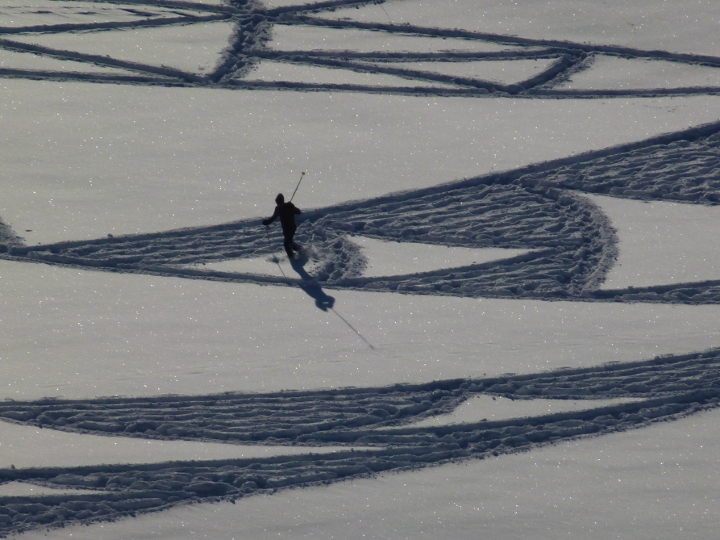Je ne sais pas comment il se repère dans sont truc au départ, ni comment il fait pour faire des arcs de cercles aussi parfaits. En plus il ne doit pas faire un pas de travers, autrement il faut attendre 30 cm de poudreuse pour recouvrir le tout et reprendre tout à zéro ..
