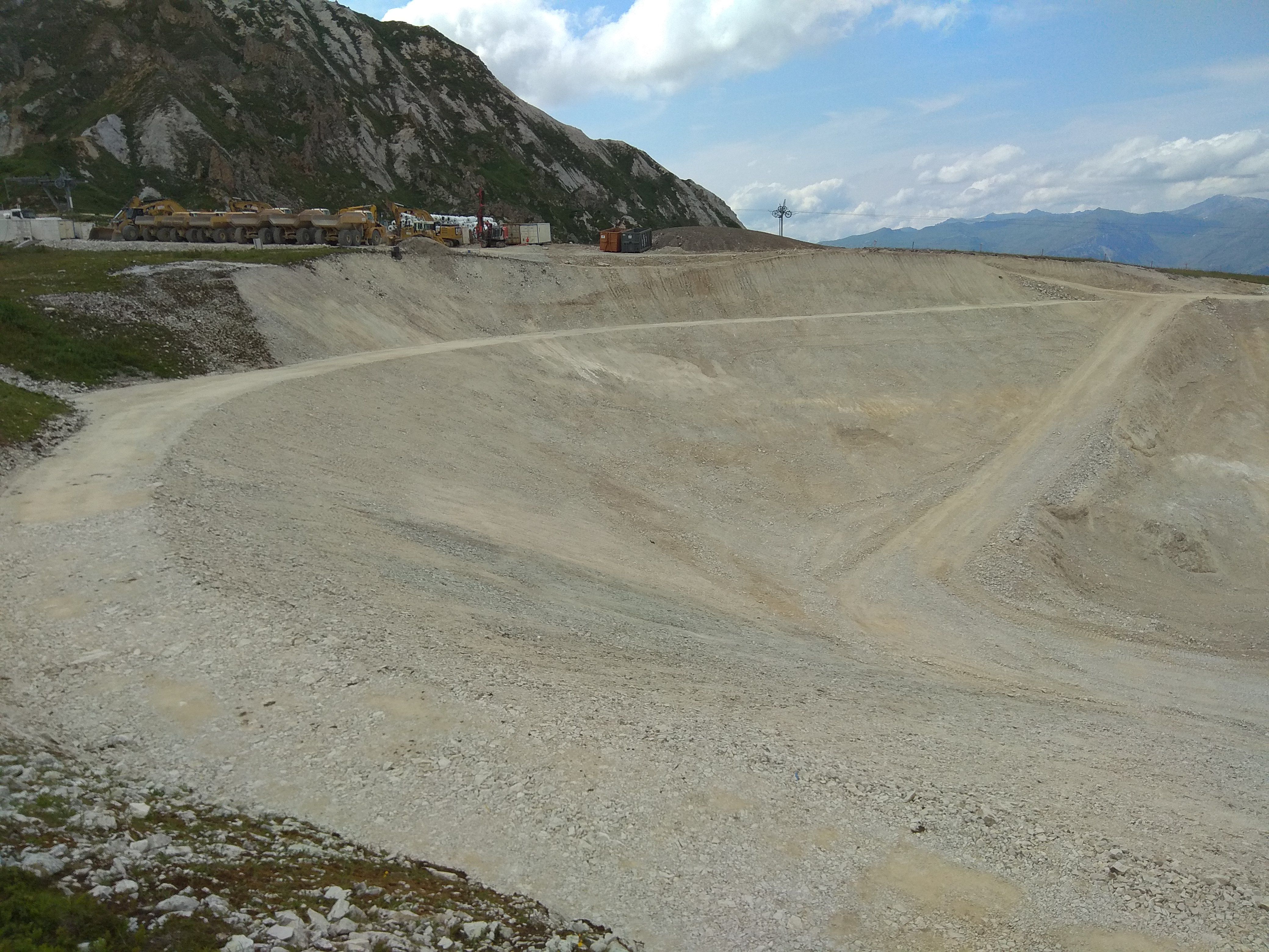 La retenue est bien avancée. Le tuyau d'alimentation de l'usine à neige apparaît bien sur la deuxième photo. Le chemin autour de la retenue est fait et vraisemblablement définitif. La distance séparant le lac naturel de la retenue collinaire est plutôt conséquente, ce qui laisse présager une belle intégration dans le paysage.