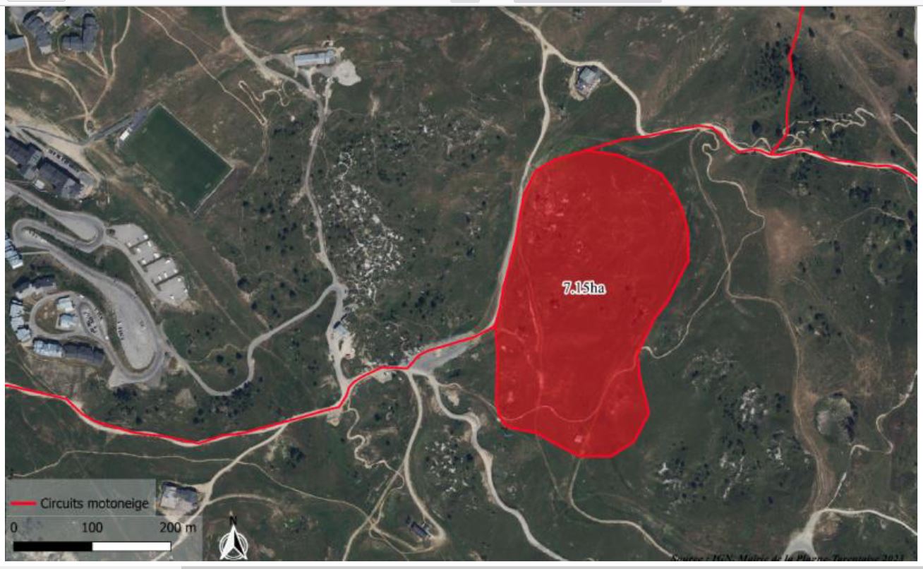 J'ai vite lu, mais si je comprends bien, cela ouvre la voie à 4 "occupants", avec en tout (ou chacun ?) 7 véhicules, qui se partageraient une zone d'évolution de 7.15 ha (cf photo) avec des accès balisés. D'après la photo, c'est le joli et normalement calme secteur des dolines (avec toutes les marmottes l'été) au dessus de Plagne Villages.