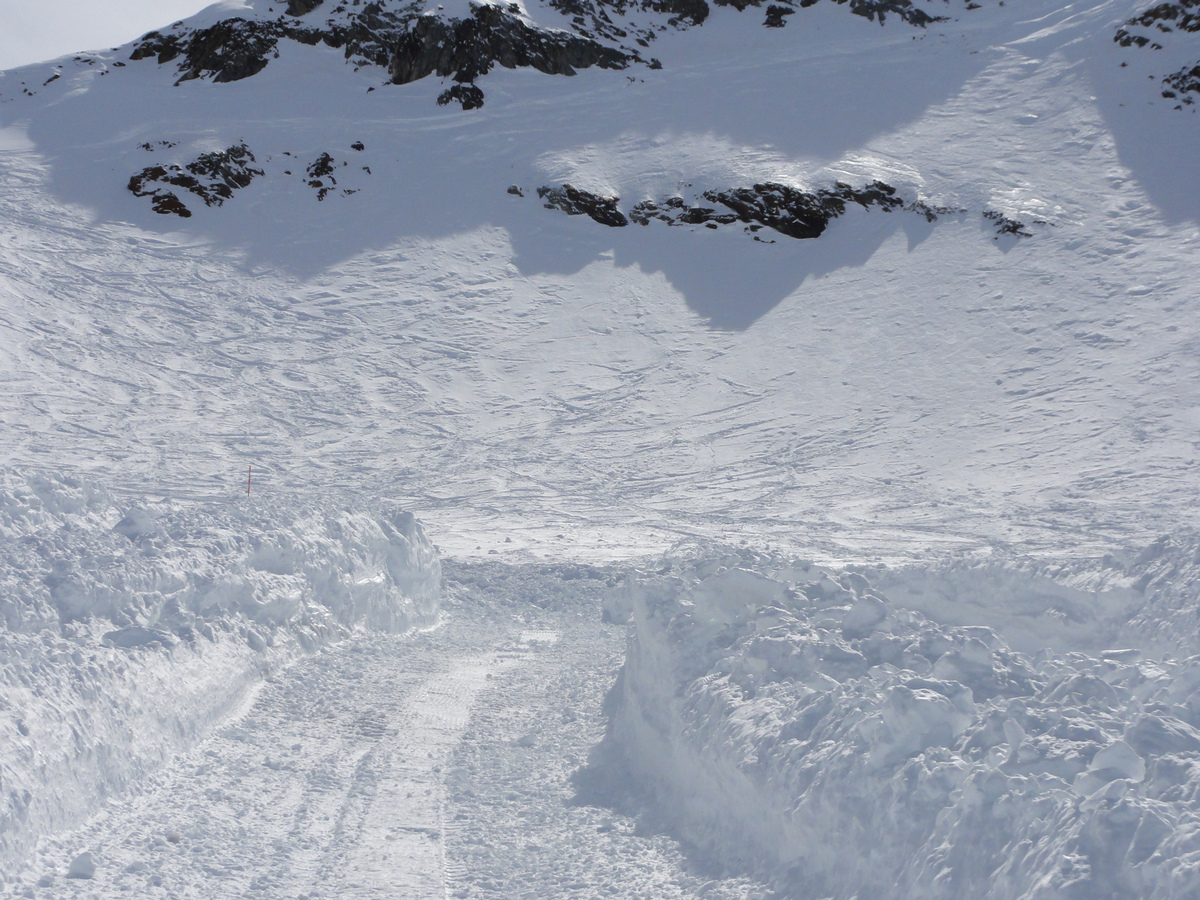 Le glacier a été repeigné fin Mars 2014 à droite de la piste :