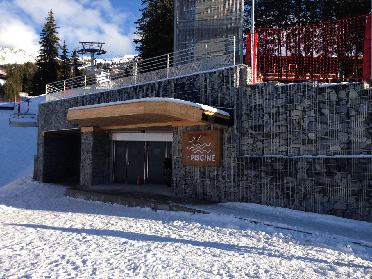 La "tour" d'accès est tout simplement une honte qui défigure le front de neige et la petite forêt de sapins.