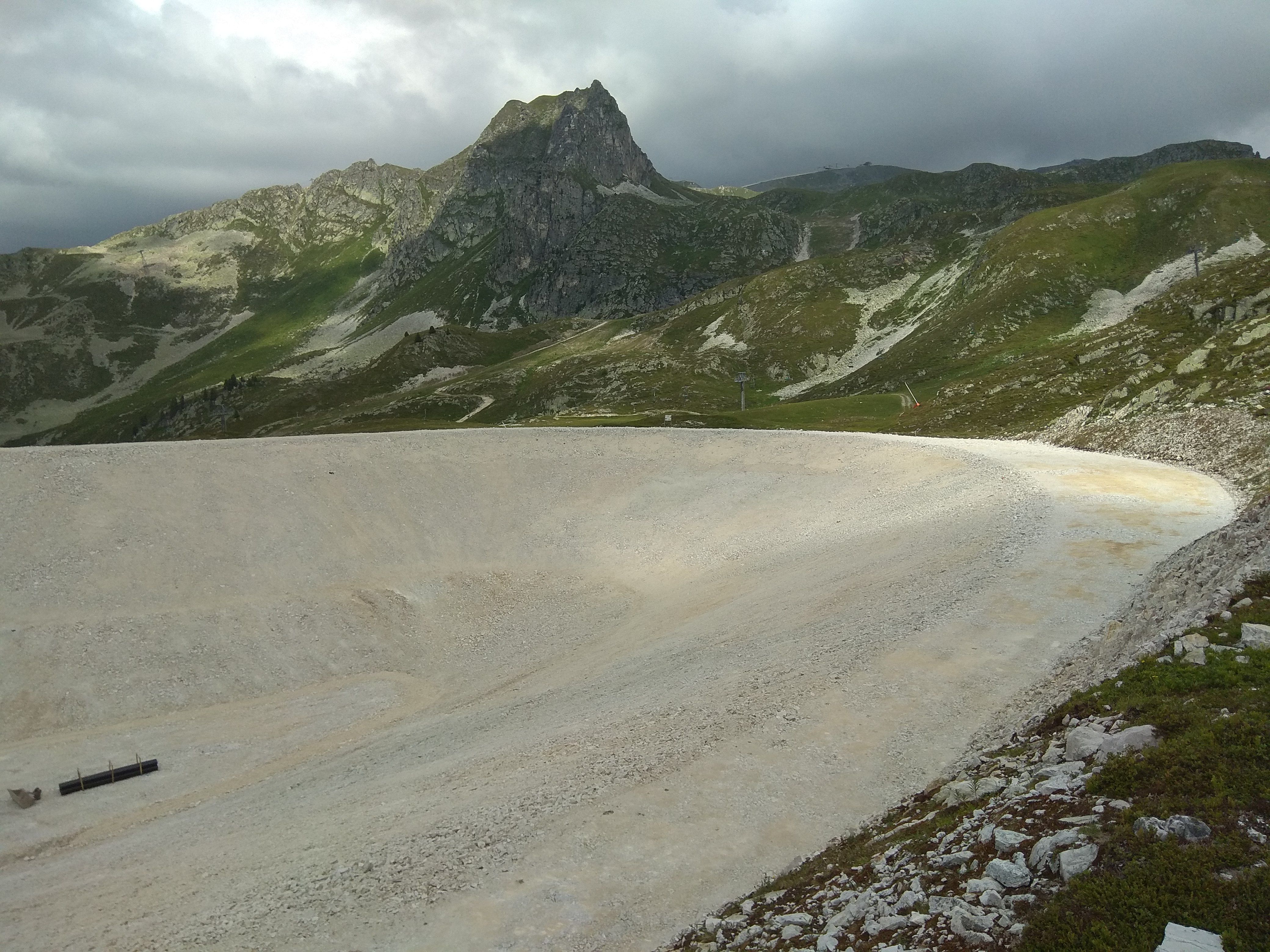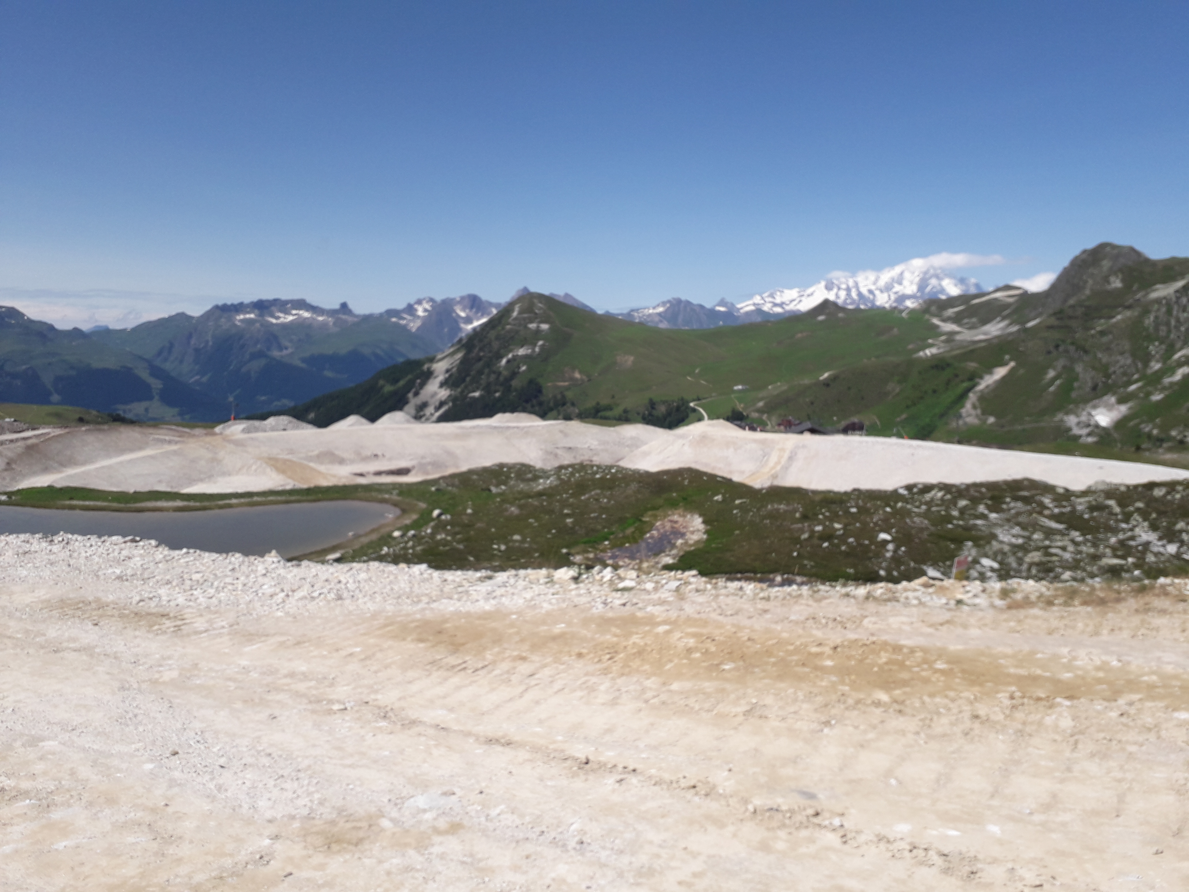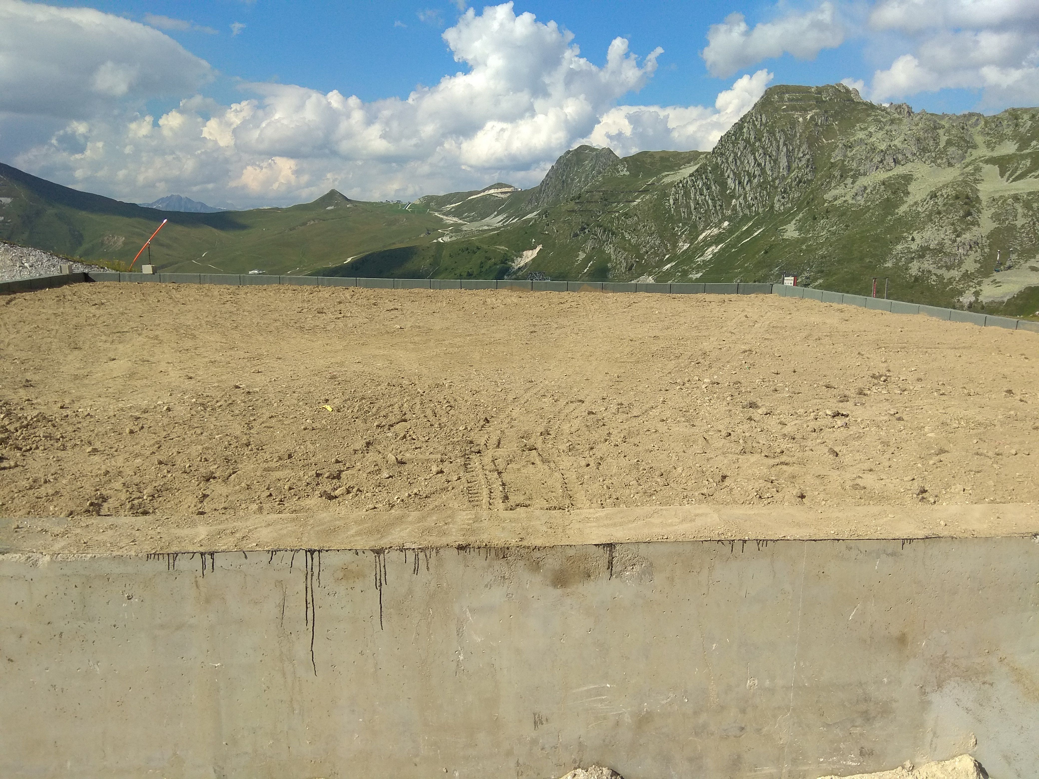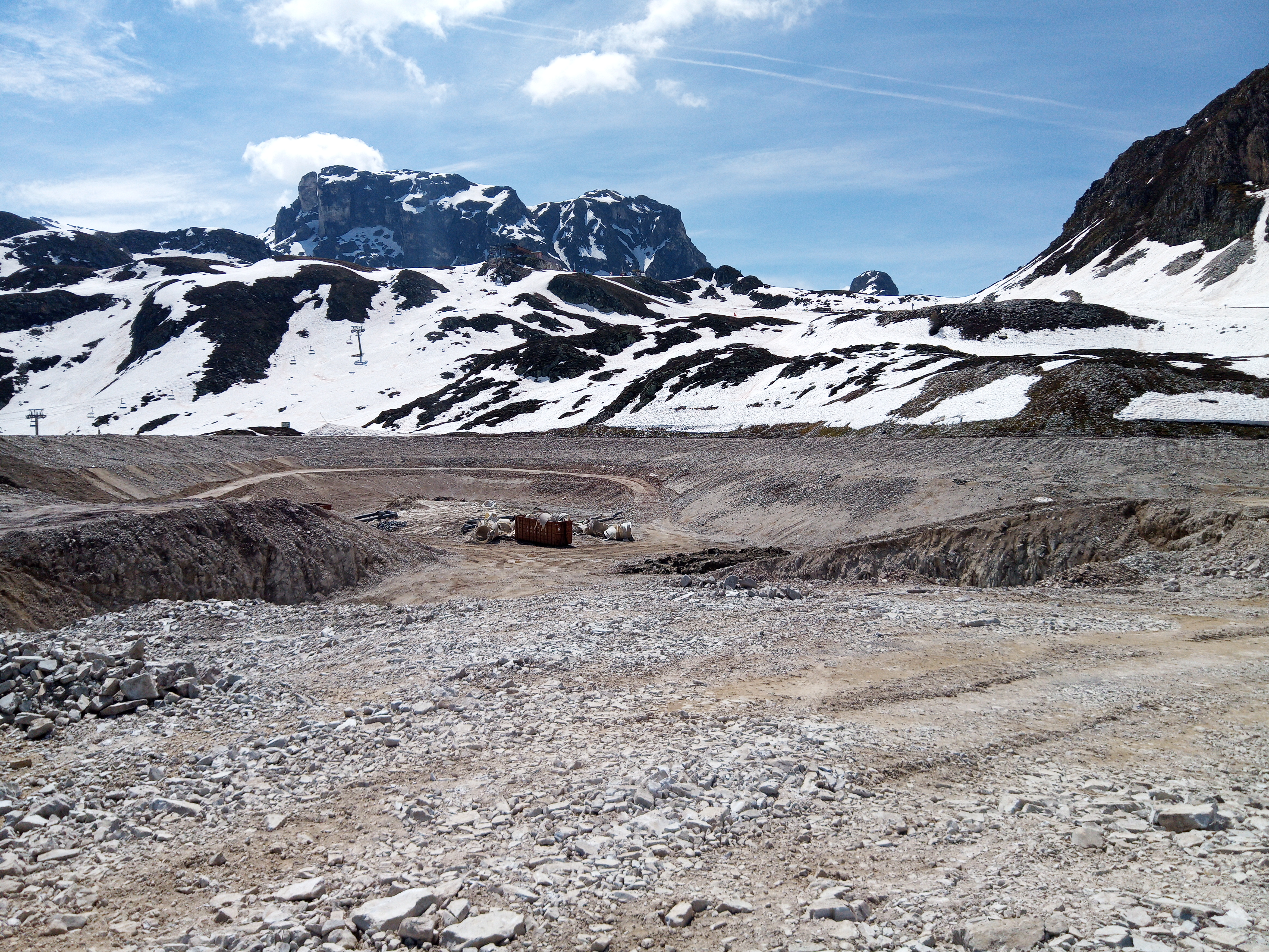 La retenue est bien avancée. Le tuyau d'alimentation de l'usine à neige apparaît bien sur la deuxième photo. Le chemin autour de la retenue est fait et vraisemblablement définitif. La distance séparant le lac naturel de la retenue collinaire est plutôt conséquente, ce qui laisse présager une belle intégration dans le paysage.