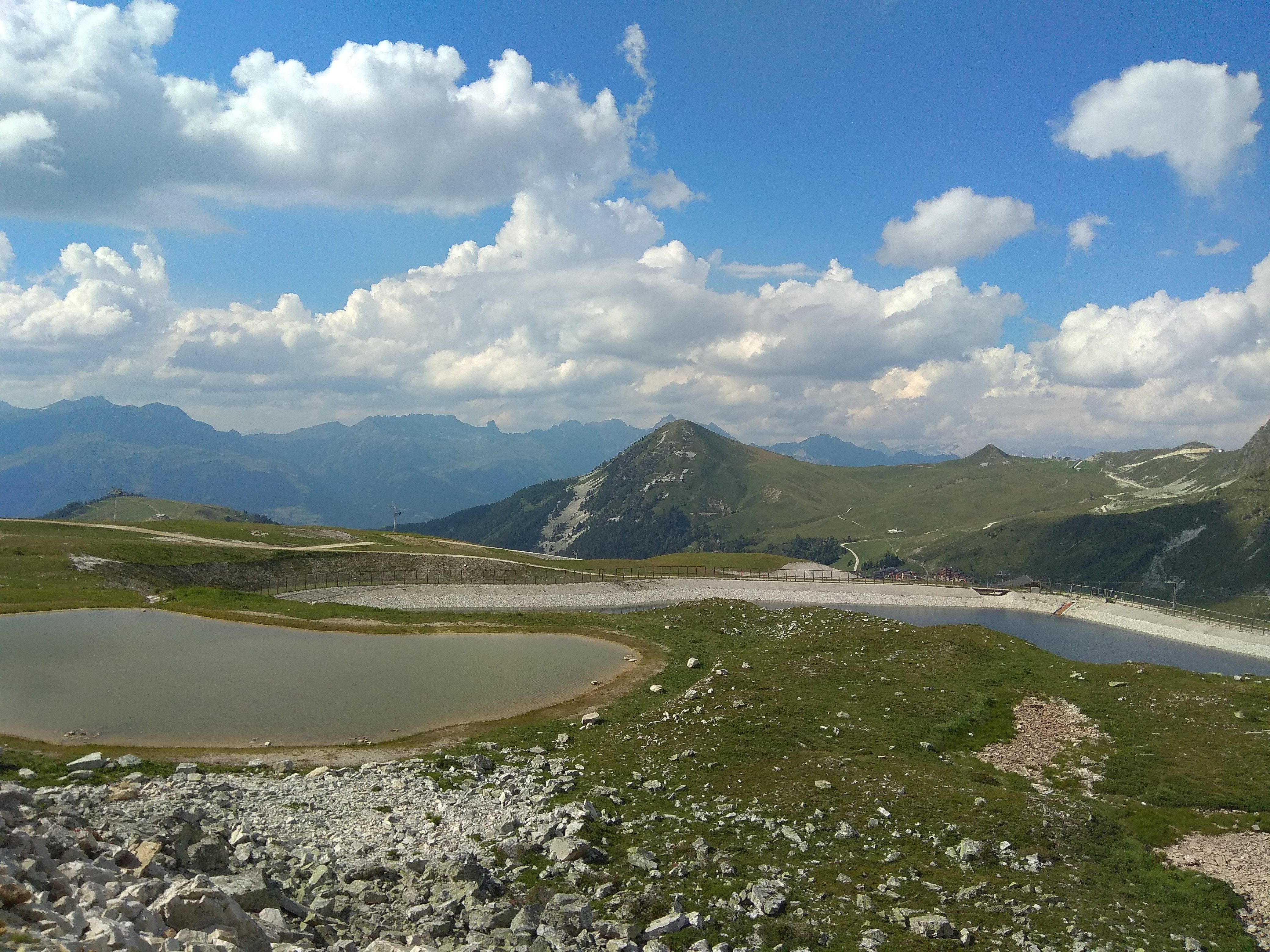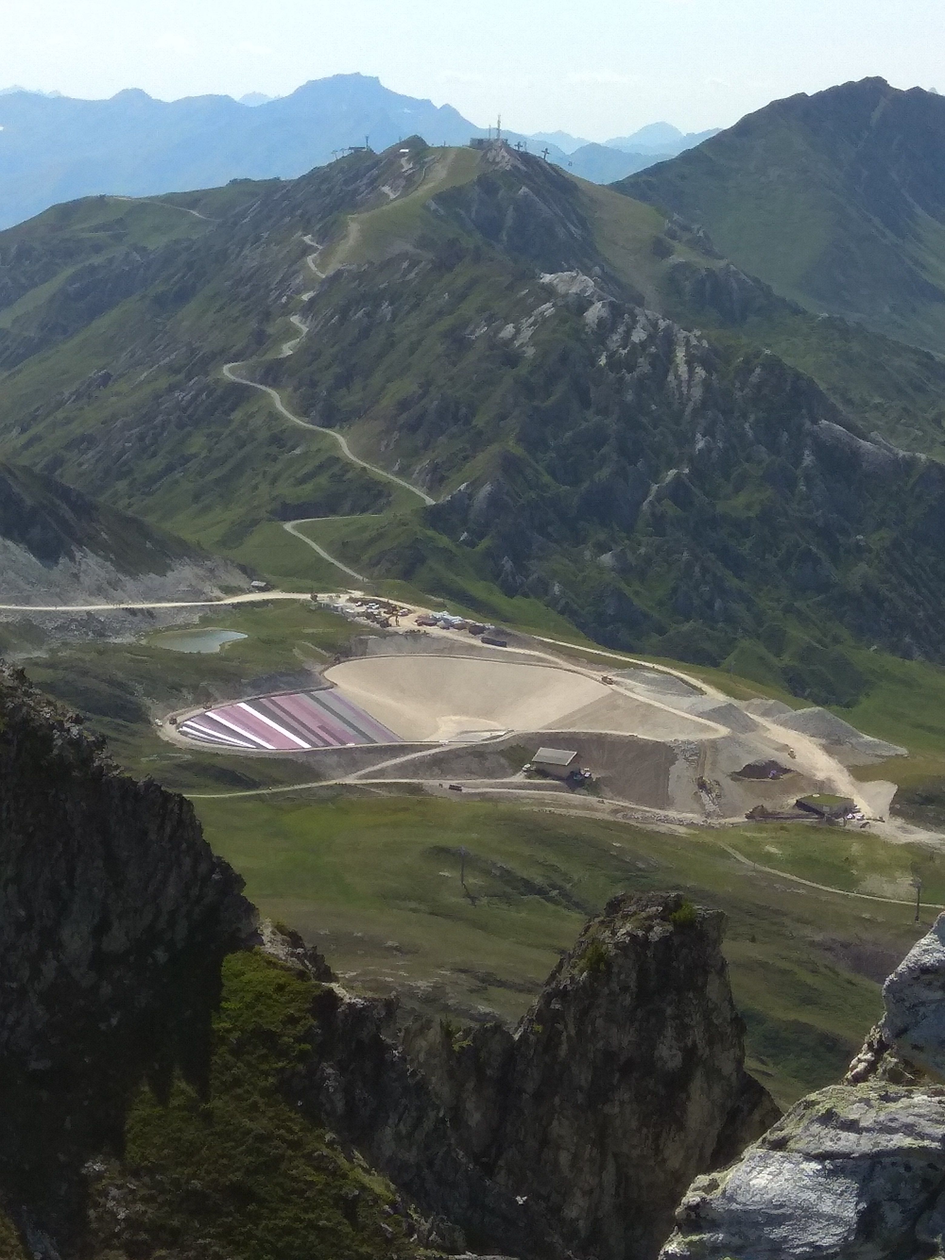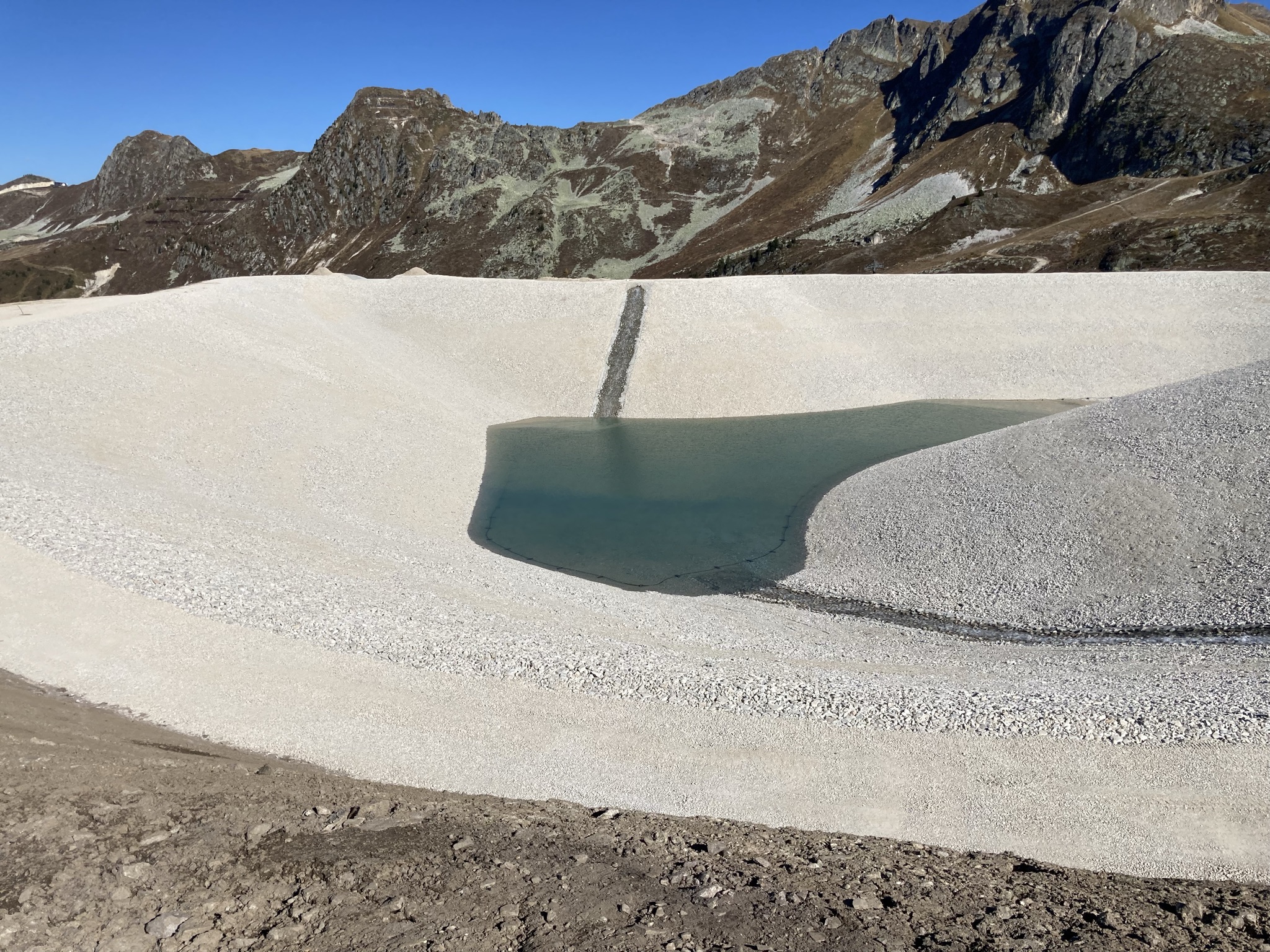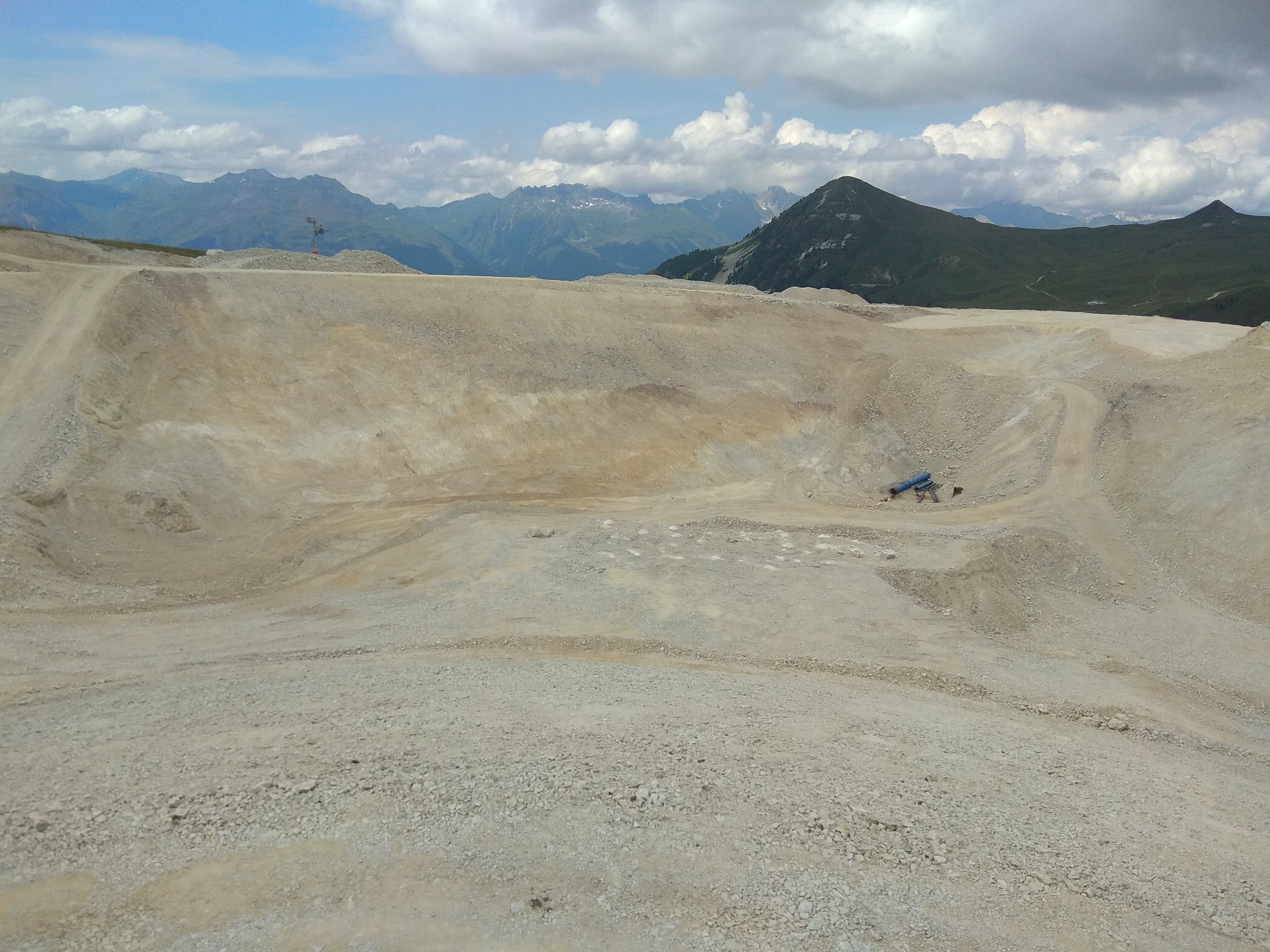 La retenue est bien avancée. Le tuyau d'alimentation de l'usine à neige apparaît bien sur la deuxième photo. Le chemin autour de la retenue est fait et vraisemblablement définitif. La distance séparant le lac naturel de la retenue collinaire est plutôt conséquente, ce qui laisse présager une belle intégration dans le paysage.