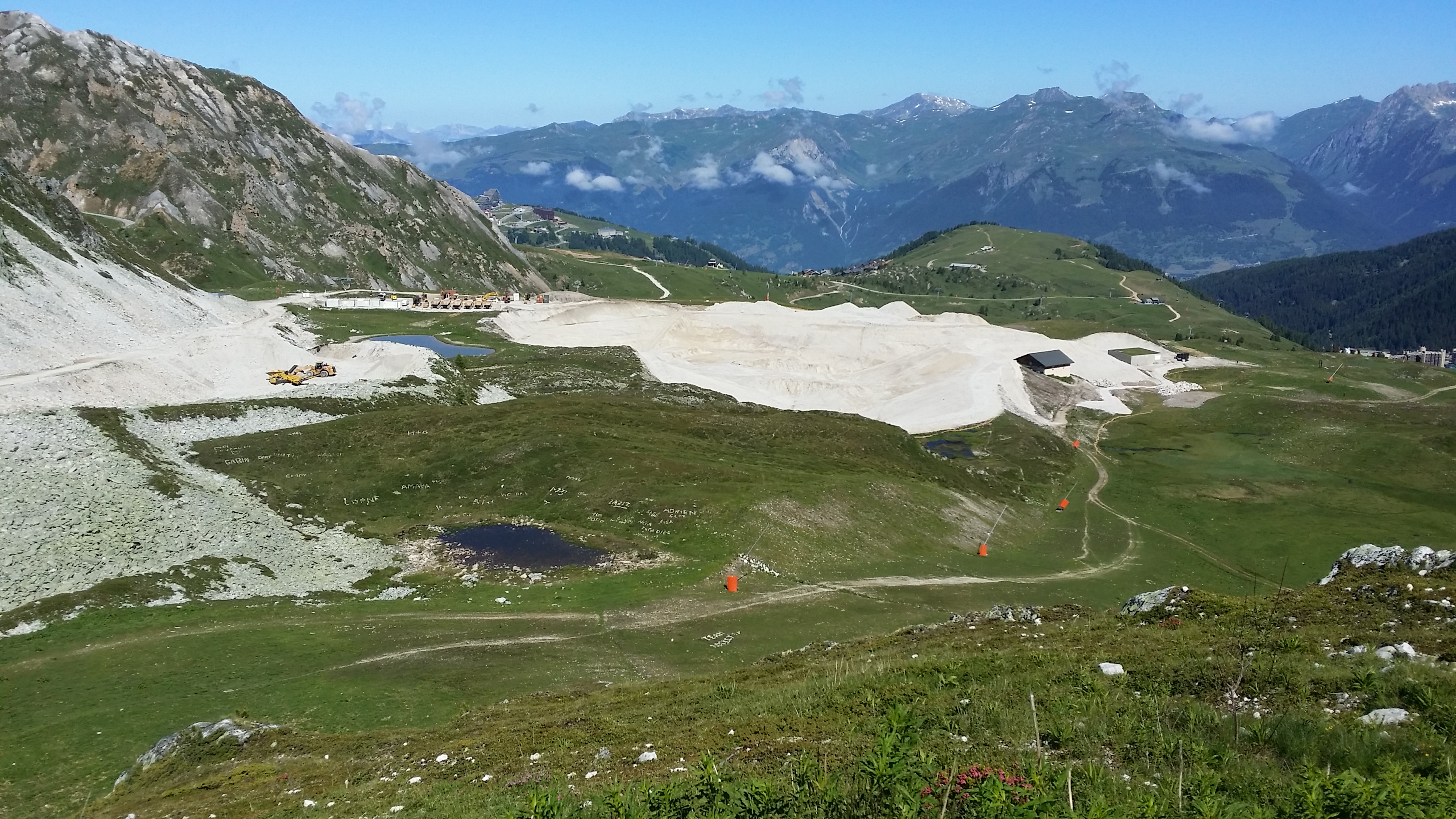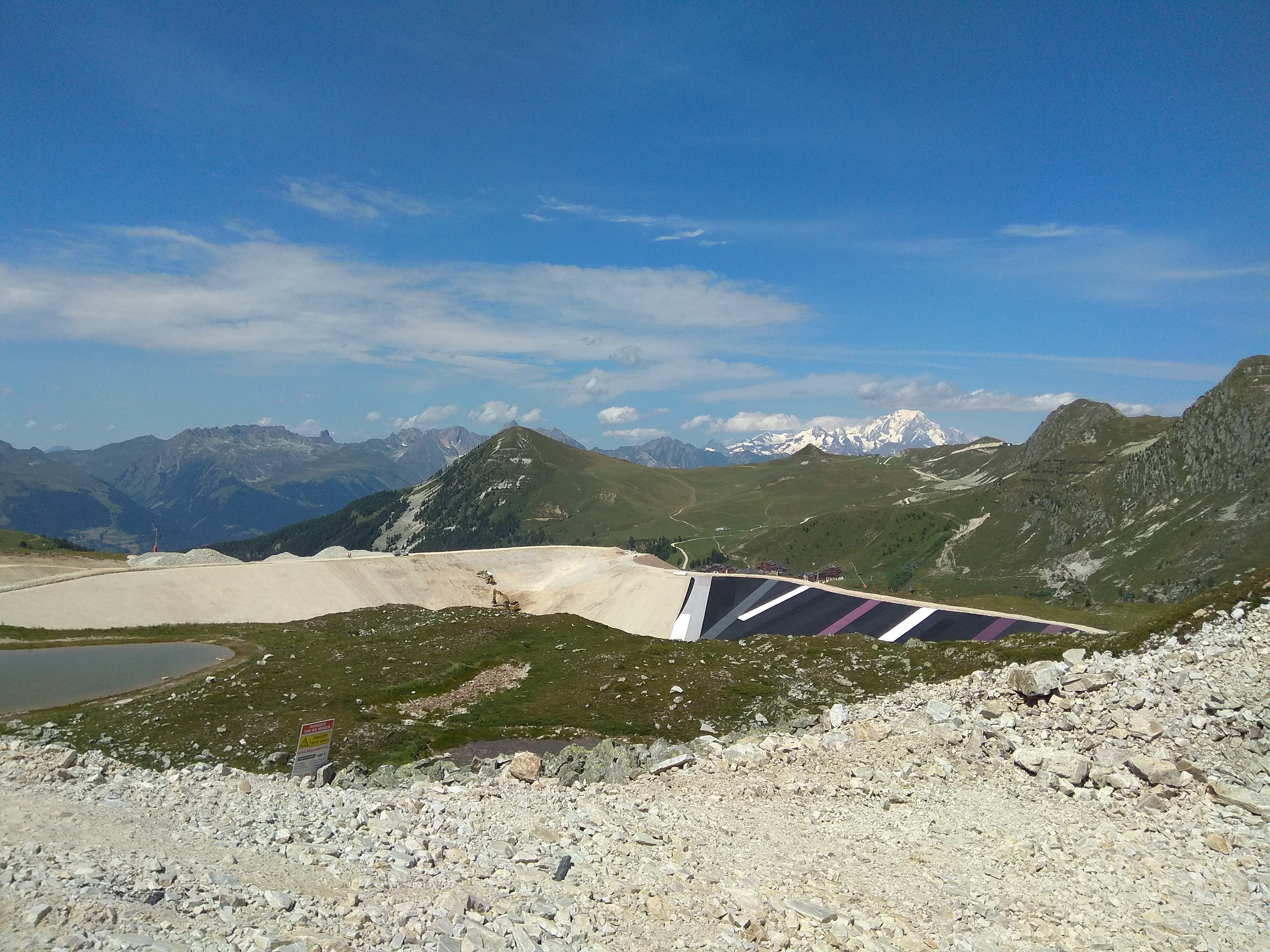 La pose de la bâche géotextile devrait bientôt commencée. Les rouleaux sont acheminés sur place depuis le parking de Plagne Villages.