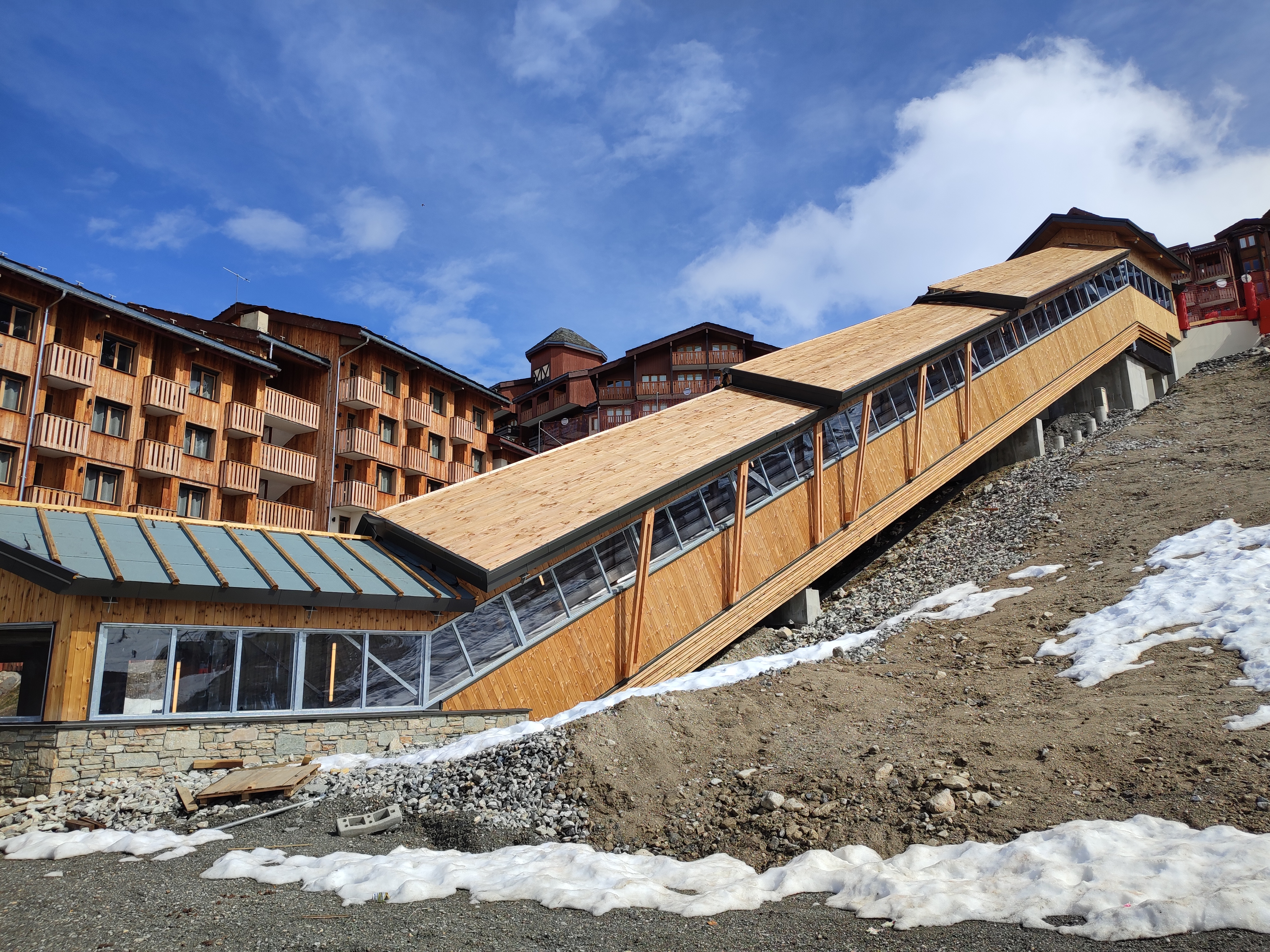 La neige fond à vitesse grand V. Le toit de l'escalator n'est pas terminé. L'incertitude demeure sur une couverture en lauzes comme prévue initialement ou en bac acier...la grande nouveauté sur BP.