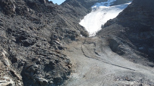 Des rochers sont apparu en plein milieu de la piste au sommet du glacier, la barre rocheuse sera bientôt d'une traite, ce qui empêchera la piste de passée.