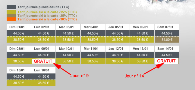 Ski à la carte, revient à 37 euros par jours, 31 ou 32 le samedi, et encore samedijeski fait souvent mieux, et les 9ème, 14ème, 19ème 24 ème jours sont à 1 euro.