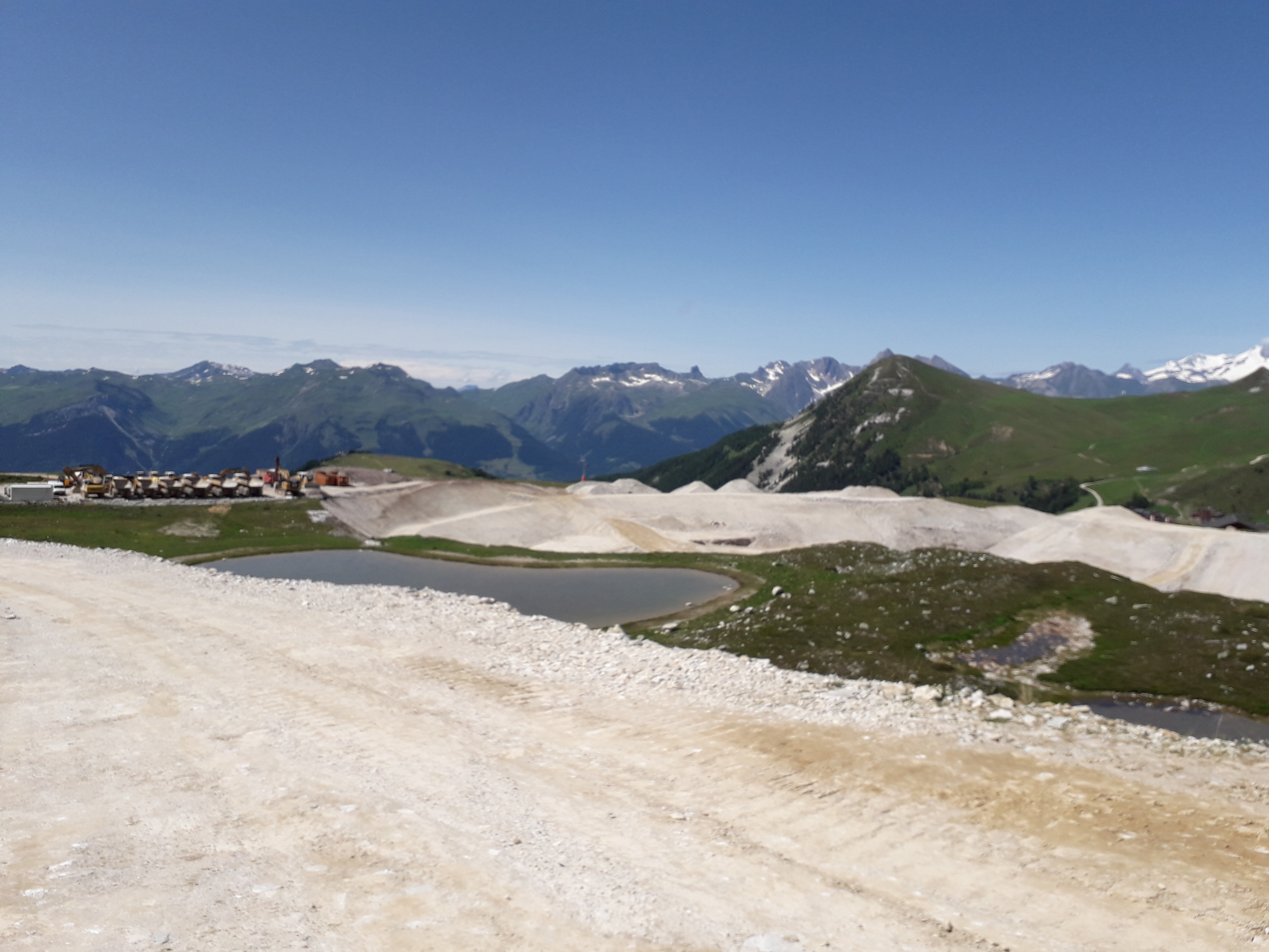 La retenue est bien avancée. Le tuyau d'alimentation de l'usine à neige apparaît bien sur la deuxième photo. Le chemin autour de la retenue est fait et vraisemblablement définitif. La distance séparant le lac naturel de la retenue collinaire est plutôt conséquente, ce qui laisse présager une belle intégration dans le paysage.