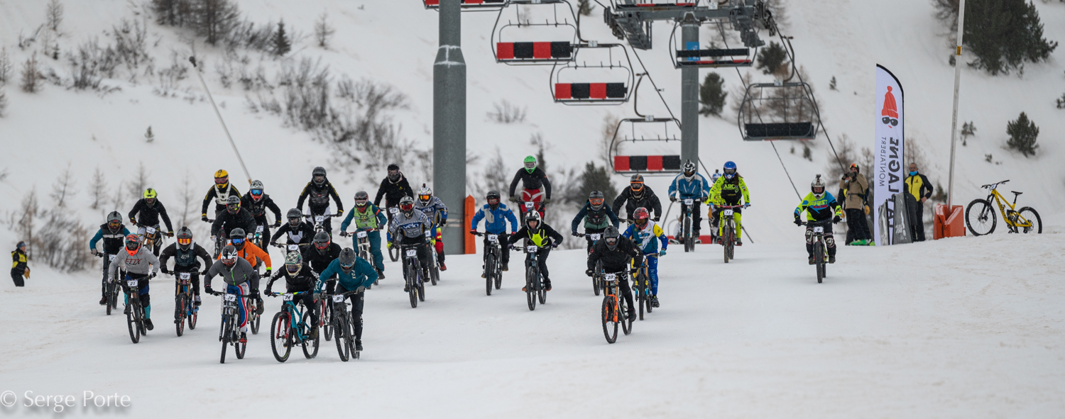 les pneus cloutés ou vissés sont interdit sur ce genre de course en masstart donc pneus normaux de VTT DH avec gros crampons
