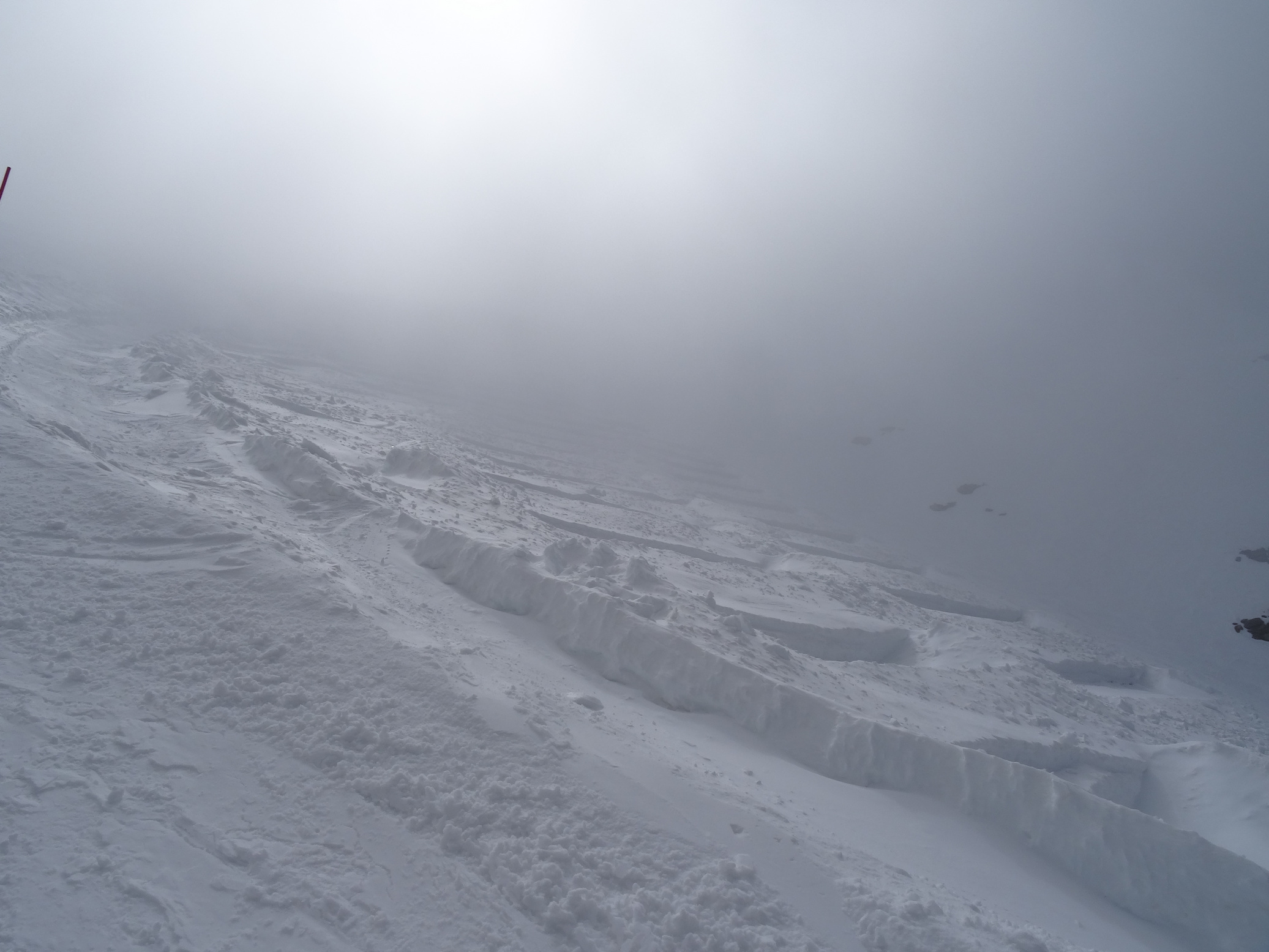 Le glacier a été repeigné fin Mars 2014 à droite de la piste :