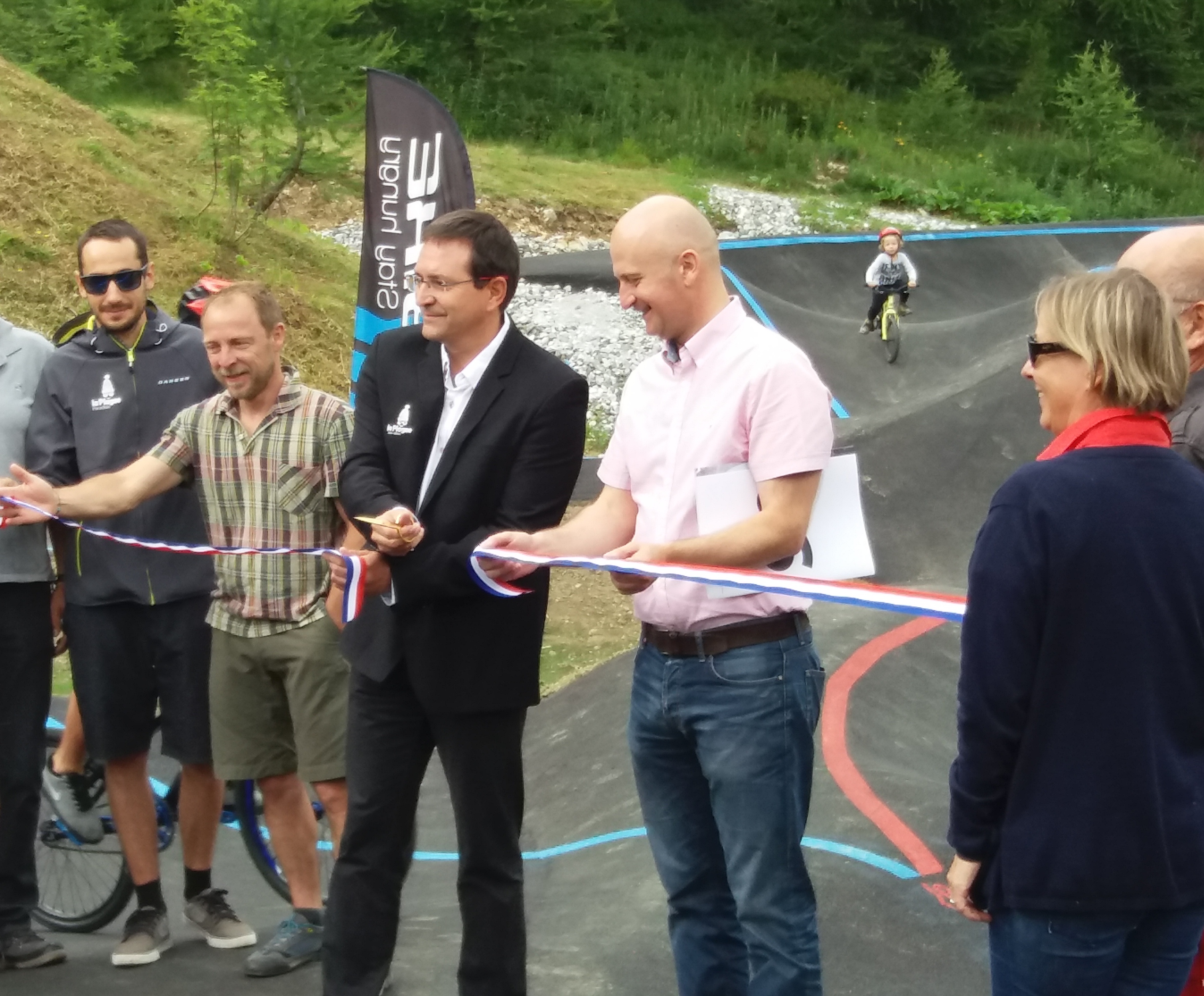 Inauguration de ce "Pumptrack", une première en vallée de la Tarentaise, selon les propos du maire. Il souligne également le virage pris il y a 3 ans pour le développement du VTT sur La Plagne avec la création de cet espace, de la nouvelle piste accessible à partir des Colosses et des pistes aménagées l'année dernière à Plagne Centre.