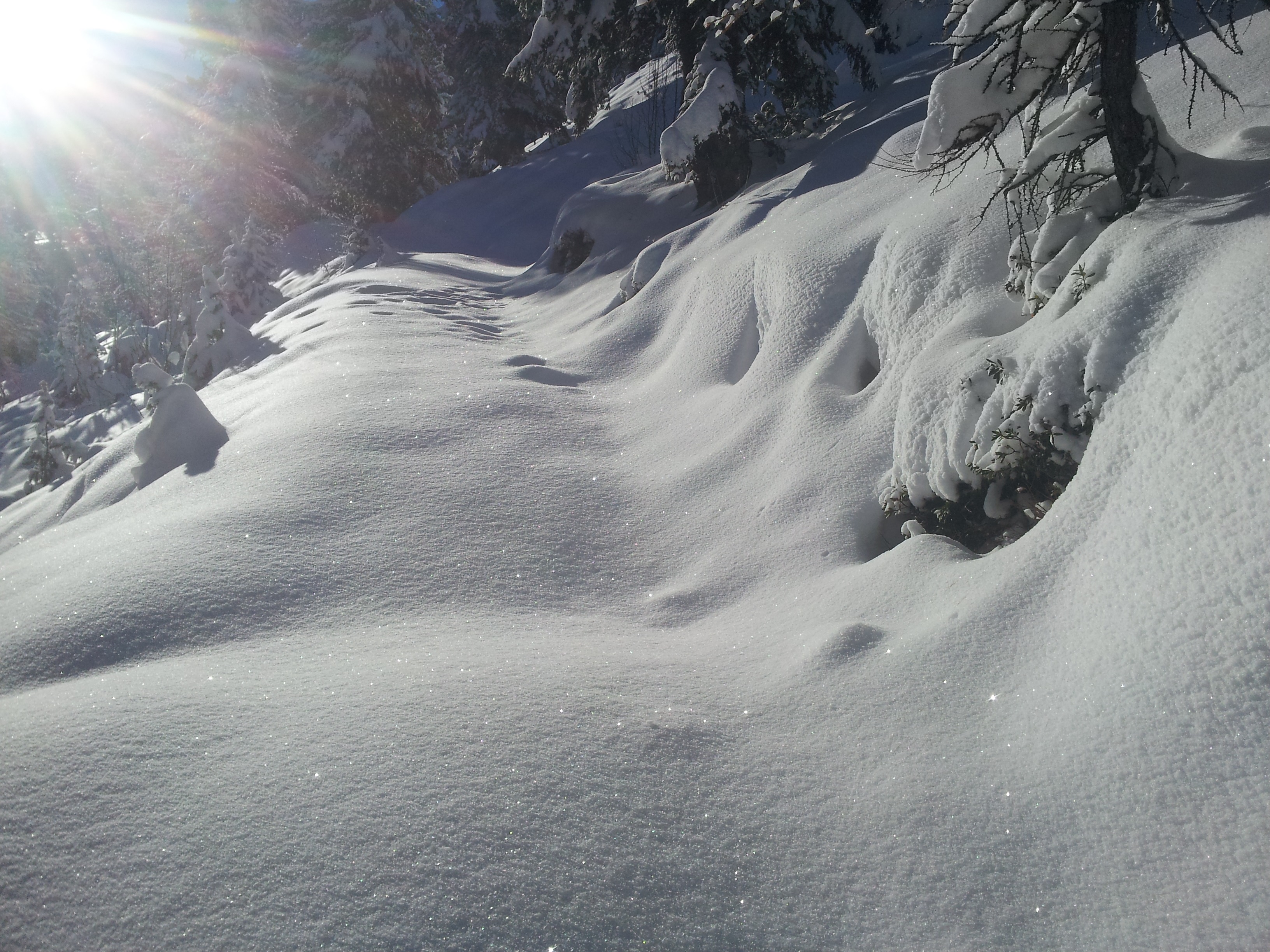 Des clichés pris ce matin à Bellecôte, sentier du dou du Praz, sentier non tracé, avec les raquettes de la neige jusqu'au genou.