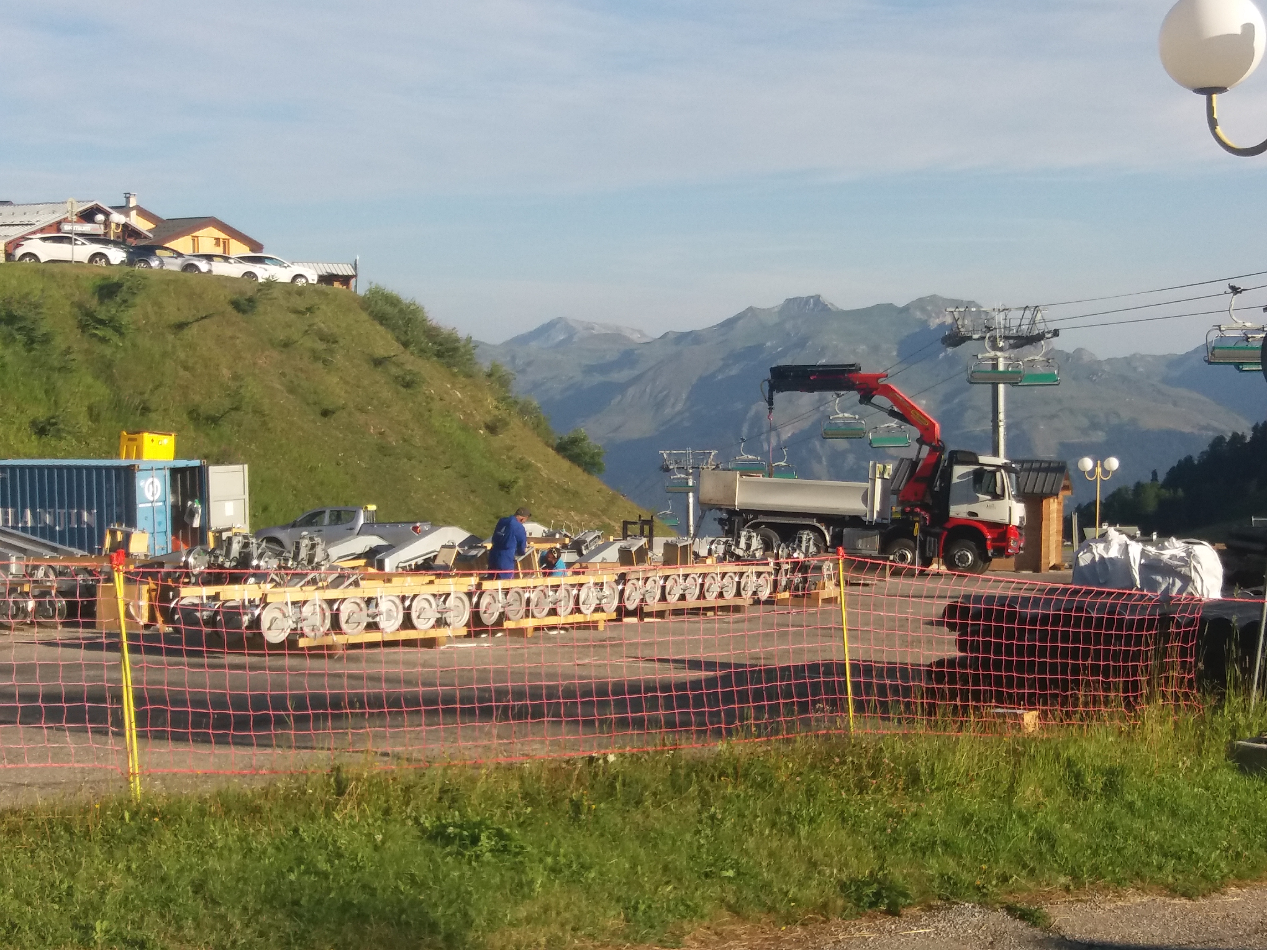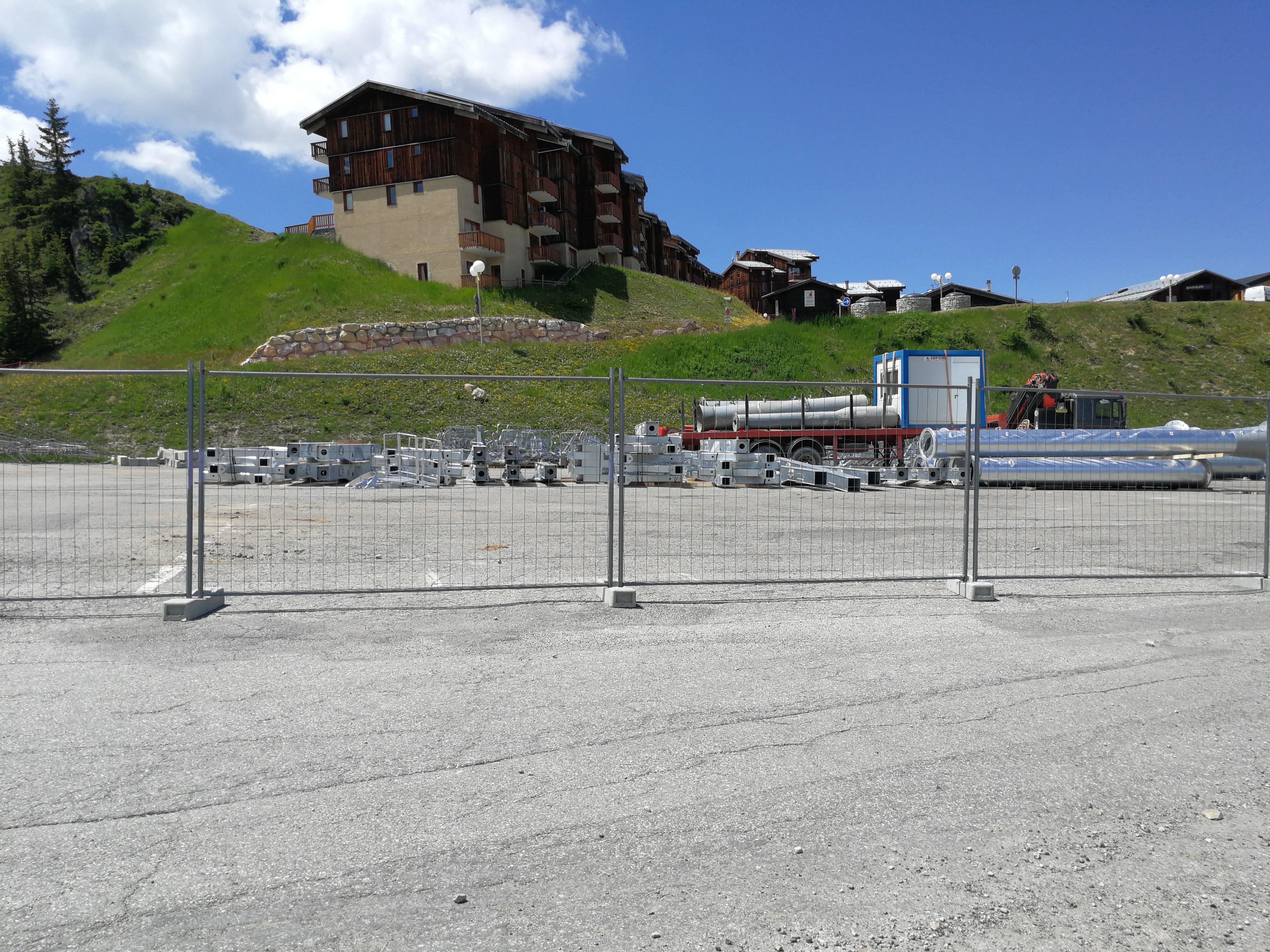Le matériel arrive... et stockage sur le parking haut de Plagne Villages.
