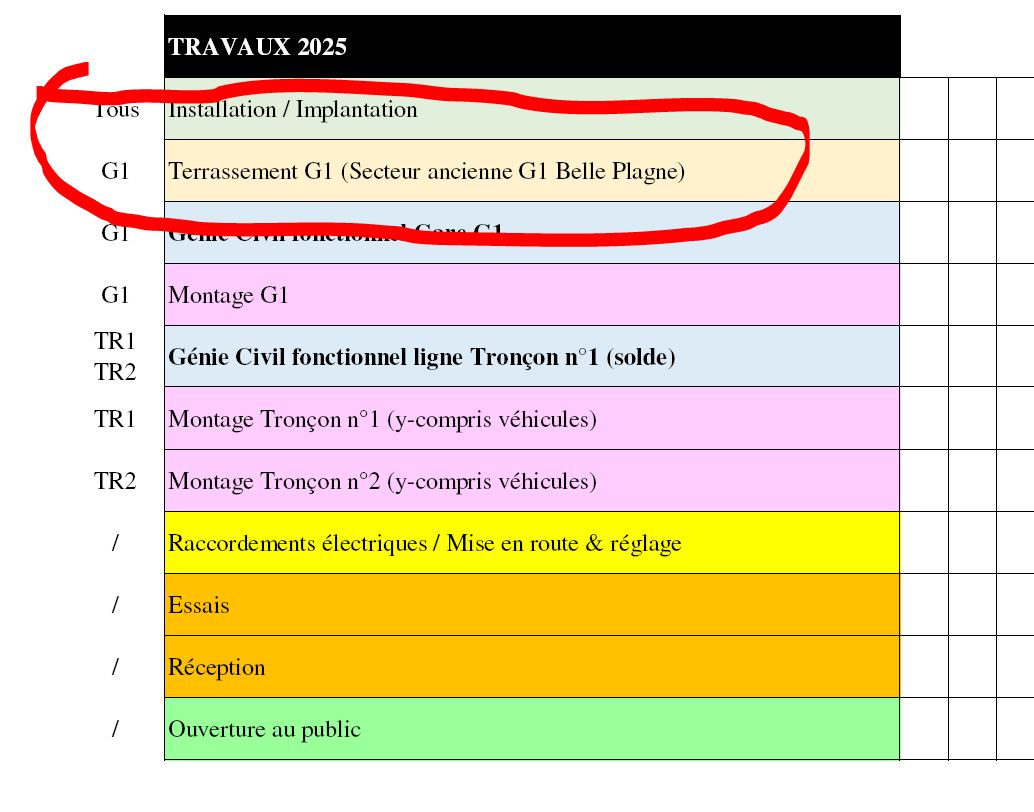 Pour relancer le débat du maintien ou non de la liaison avec Belle Plagne, le planning des travaux pour 2025 indique, je cite "Terrassement G1 (Secteur ancienne G1 Belle Plagne)"