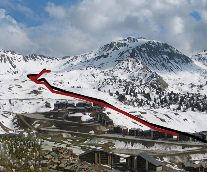 Mélange 1962-2008 avec le tracé du téléski de 1962 et en rouge le téléski actuel.