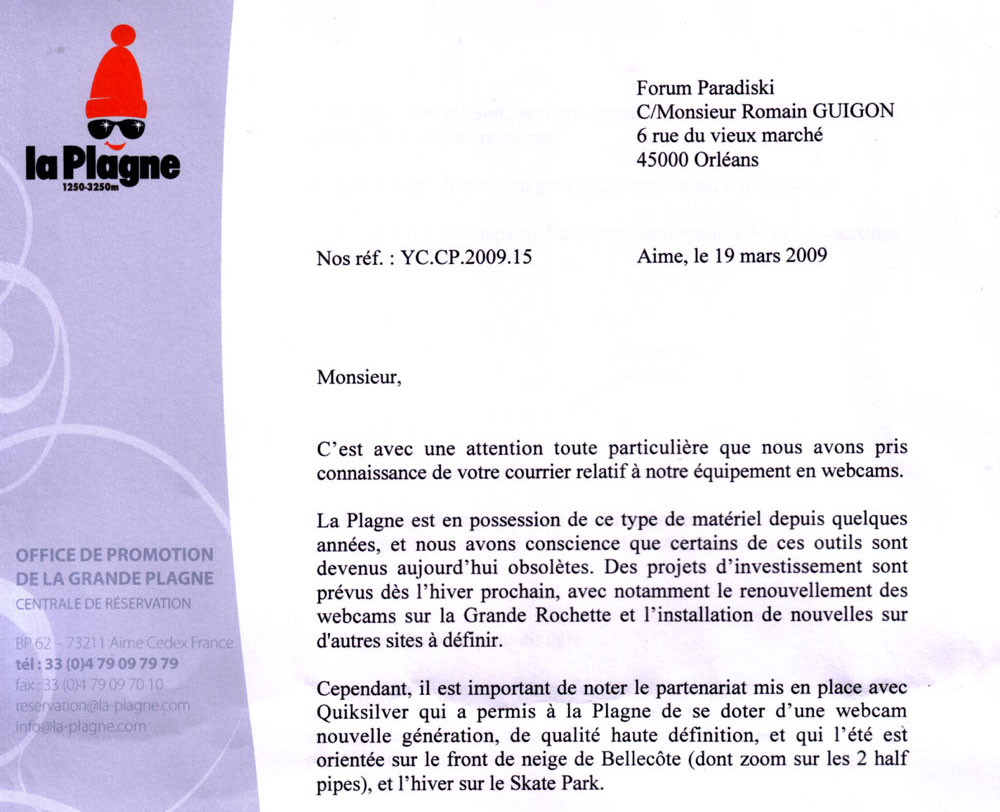 J'ai pris connaissance avec beaucoup d'attention de votre courrier daté du 25 Janvier dernier au sujet de la Webcam de la Grande Rochette.