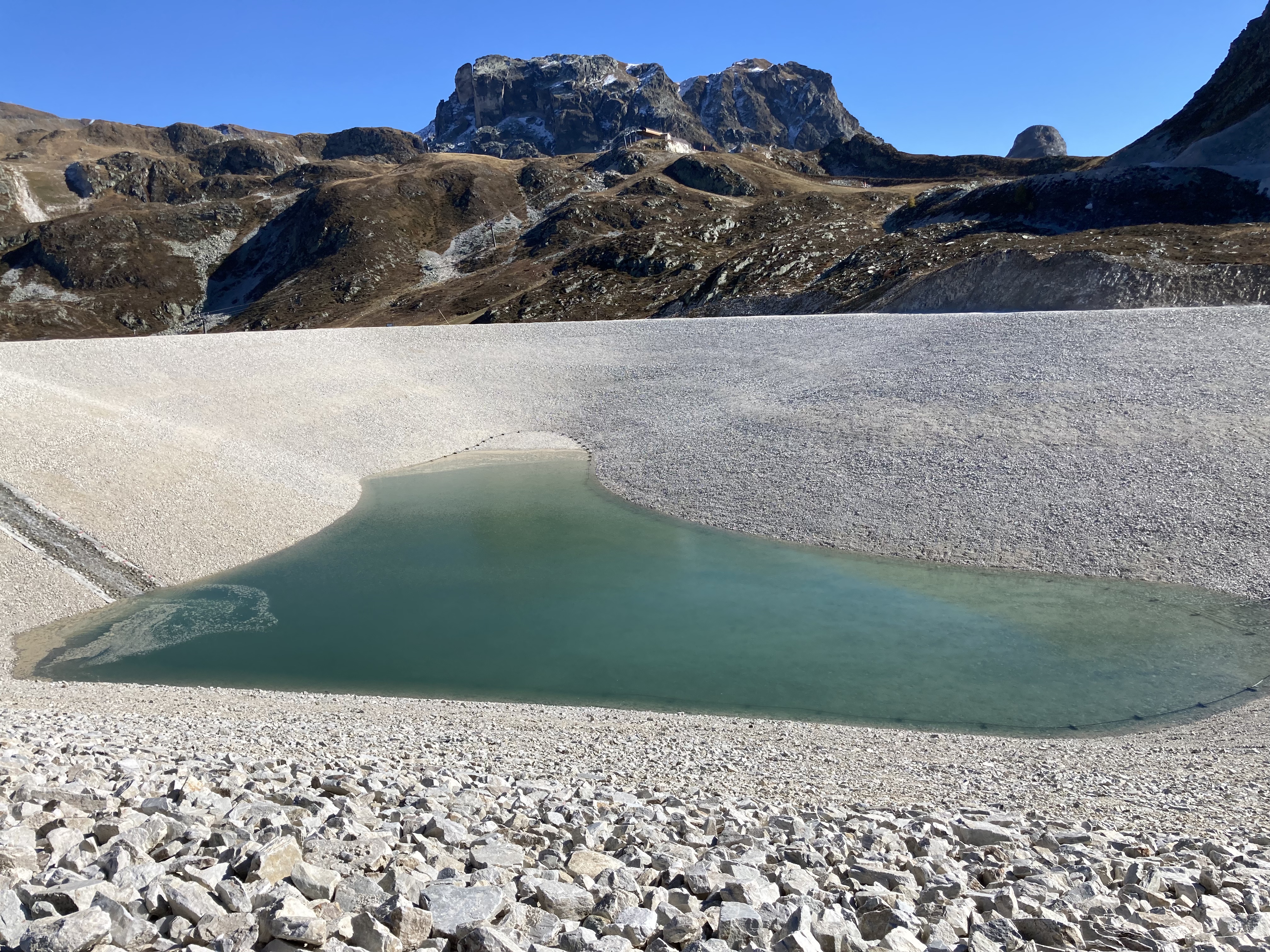 La retenue est bien avancée. Le tuyau d'alimentation de l'usine à neige apparaît bien sur la deuxième photo. Le chemin autour de la retenue est fait et vraisemblablement définitif. La distance séparant le lac naturel de la retenue collinaire est plutôt conséquente, ce qui laisse présager une belle intégration dans le paysage.
